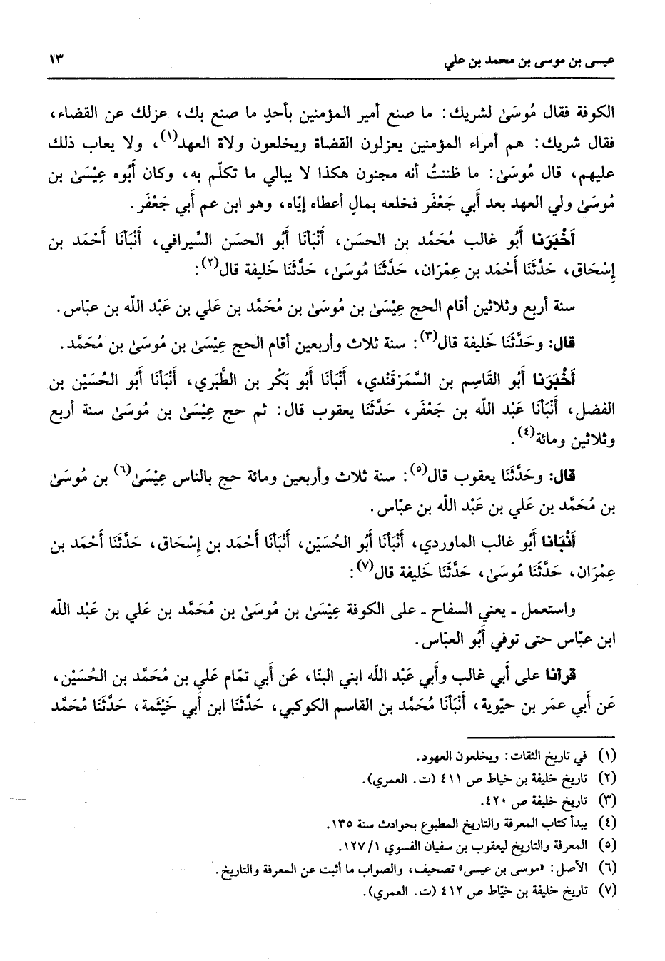 الكوفة فقال موسى لشريك ما صنع أمير المؤمنين بأحد ما صنع بك عزلك عن القضاء فقال شريك هم أمراء المؤمنين يعزلون القضاة ويخلعون ولاة العهد (1) ولا يعاب ذلك عليهم قال موسى ما ظننت أنه مجنون هكذا لا يبالي ما تكلم به وكان أبوه عيسى بن موسى ولي العهد بعد أبي جعفر فخلعه بمال وأعطاه إياه وهو ابن عم أبي جعفر أخبرنا أبو غالب محمد بن الحسن أنبأنا أبو الحسن السيرافي أنبأنا أحمد بن إسحاق حدثنا أحمد بن عمران حدثنا موسى حدثنا خليفة قال (2) سنة أربع وثلاثين أقام الحج عيسى بن موسى بن محمد بن علي بن عبد الله بن عباس قال وحدثنا خليفة قال (3) سنة ثلاث وأربعين أقام الحج عيسى بن موسى بن محمد أخبرنا أبو القاسم بن السمرقندي أنبأنا أبو بكر بن الطبري أنبأنا أبو الحسين بن الفضل أنبأنا عبد الله بن جعفر حدثنا يعقوب قال ثم حج عيسى بن موسى سنة أربع وثلاثين ومائة (4) قال وحدثنا يعقوب قال (5) سنة ثلاث وأربعين ومائة حج بالناس عيسى (6) بن موسى بن محمد بن علي بن عبد الله بن عباس أنبأنا أبو غالب الماوردي أنبأنا أبو الحسين أنبأنا أحمد بن إسحاق حدثنا أحمد بن عمران حدثنا موسى حدثنا خليفة قال (7) واستعمل يعني السفاح على الكوفة عيسى بن موسى بن محمد بن علي بن عبد الله ابن عباس حتى توفي أبو العباس قرأنا على أبي غالب وأبي عبد الله ابني البنا عن أبي تمام علي بن محمد بن الحسين عن أبي عمر بن حيوية أنبأنا محمد بن القاسم الكوكبي حدثنا ابن أبي حيثمة حدثنا محمد