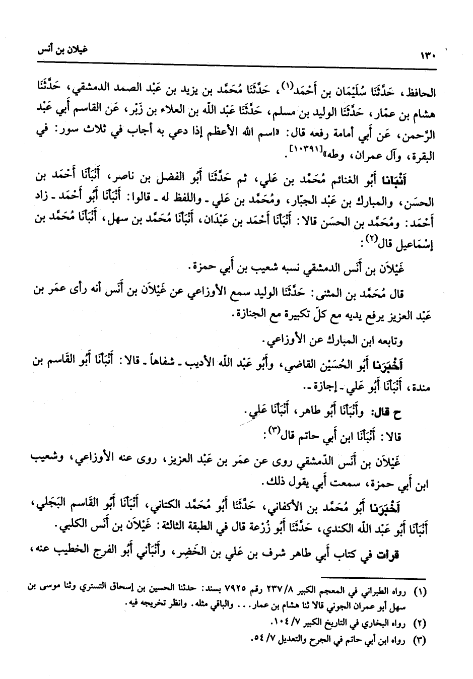 الحافظ حدثنا سليمان بن أحمد (1) حدثنا محمد بن يزيد بن عبد الصمد الدمشقي حدثنا هشام بن عمار حدثنا الوليد بن مسلم حدثنا عبد الله بن العلاء بن زبر عن القاسم أبي عبد الرحمن عن أبي أمامة رفعه قال اسم الله الأعظم إذا دعي به أجاب في ثلاث سور في البقرة وآل عمران وطه أنبأنا أبو الغنائم محمد بن علي ثم حدثنا أبو الفضل بن ناصر أنبأنا أحمد بن الحسن والمبارك بن عبد الجبار ومحمد بن علي واللفظ له قالوا أنبأنا أبو أحمد زاد أحمد ومحمد بن الحسن قالا أنبأنا أحمد بن عبدان أنبأنا محمد بن سهل أنبأنا محمد بن إسماعيل قال (2) غيلان بن أنس الدمشقي نسبه شعيب بن أبي حمزة قال محمد بن المثنى حدثنا الوليد سمع الأوزاعي عن غيلان بن أنس أنه رأى عمر بن عبد العزيز يرفع يديه مع كل تكبيرة مع الجنازة وتابعه ابن المبارك عن الأوزاعي أخبرنا أبو الحسين القاضي وأبو عبد الله الأديب شفاها قالا أنبأنا أبو القاسم بن مندة أنبأنا أبو علي إجازة ح قال وأنبأنا أبو طاهر أنبأنا علي قالا أنبأنا ابن أبي حاتم قال (3) غيلان بن أنس الدمشقي روى عن عمر بن عبد العزيز روى عنه الأوزاعي وشعيب ابن أبي حمزة سمعت أبي يقول ذلك أخبرنا أبو محمد بن الأكفاني حدثنا أبو محمد الكتاني أنبأنا أبو القاسم البجلي أنبأنا أبو عبد الله الكندي حدثنا أبو زرعة قال في الطبقة الثالثة غيلان بن أنس الكلبي قرأت في كتاب أبي طاهر شرف بن علي بن الخضر وأنبأني أبو الفرج الخطيب عنه