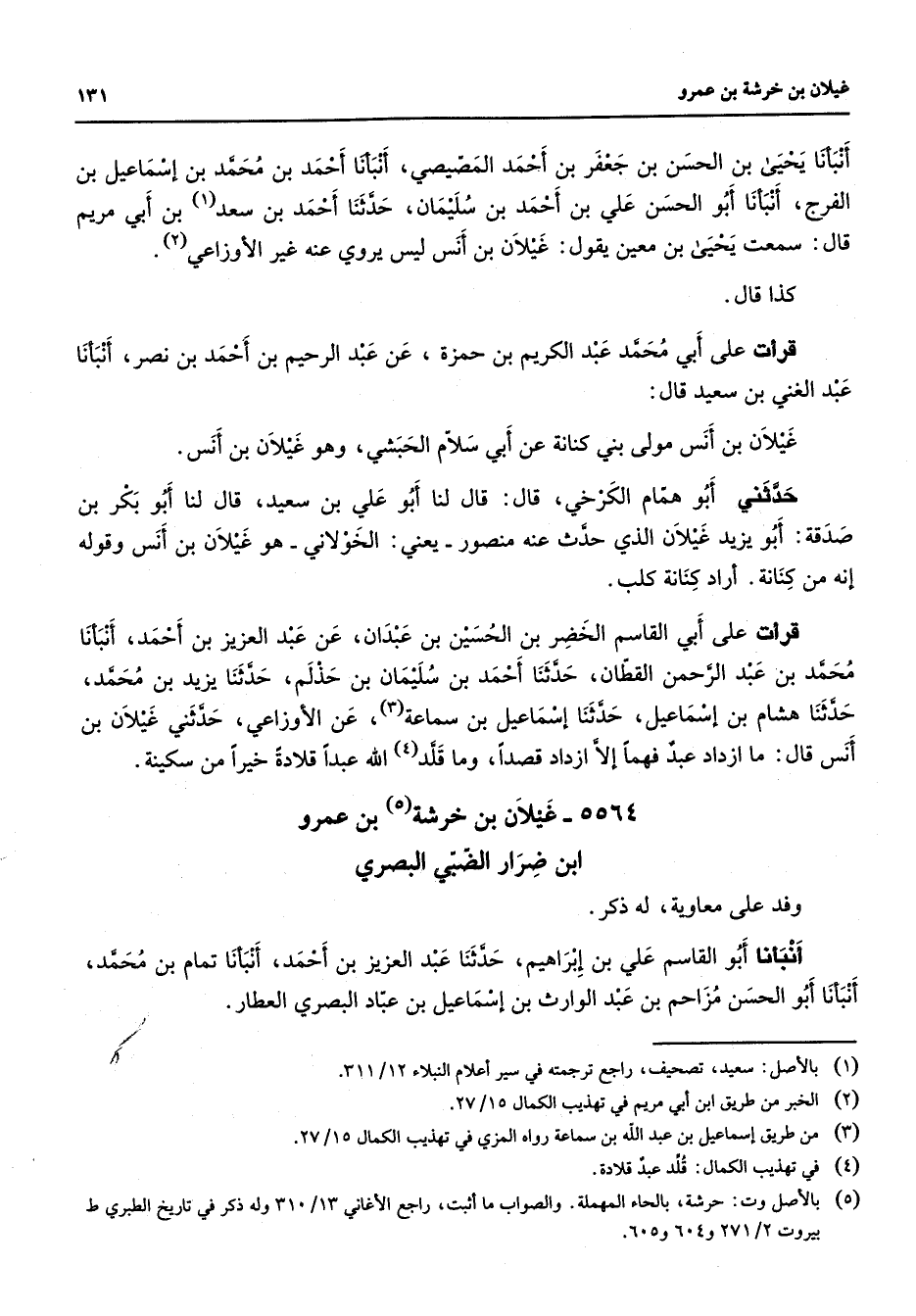 أنبأنا يحيى بن الحسن بن جعفر بن أحمد المصيصي أنبأنا أحمد بن محمد بن إسماعيل بن الفرج أنبأنا أبو الحسن علي بن أحمد بن سليمان حدثنا أحمد بن سعد (1) بن أبي مريم قال سمعت يحيى بن معين يقول غيلان بن أنس ليس يروي عنه غير الأوزاعي (2) كذا قال قرأت على أبي محمد عبد الكريم بن حمزة عن عبد الرحيم بن أحمد بن نصر أنبأنا عبد الغني بن سعيد قال غيلان بن أنس مولى بني كنانة عن أبي سلام الحبشي وهو غيلان بن أنس حدثني أبو همام الكرخي قال قال لنا أبو علي بن سعيد قال لنا أبو بكر بن صدقة أبو يزيد غيلان الذي حدث عنه منصور يعني الخولاني هو غيلان بن أنس وقوله إنه من كنانة أراد كنانة كلب قرأت على أبي القاسم الخضر بن الحسين بن عبدان عن عبد العزيز بن أحمد أنبأنا محمد بن عبد الرحمن القطان حدثنا أحمد بن سليمان بن حذلم حدثنا يزيد بن محمد حدثنا هشام بن إسماعيل حدثنا إسماعيل بن سماعة (3) عن الأوزاعي حدثني غيلان بن أنس قال ما ازداد عبد فهما إلا ازداد قصدا وما قلد (4) الله عبدا قلادة خيرا من سكينة