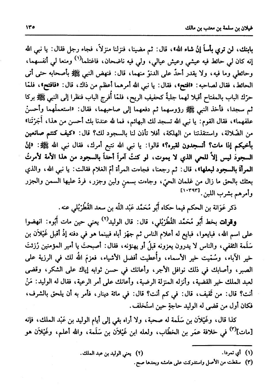 بابنك لن تري بأسا إن شاء الله) قال ثم مضينا فنزلنا منزلنا فجاء رجل فقال يا نبي الله إنه كان لي حائط فيه عيشي وعيش عيالي ولي فيه ناضحان فاغتلما (1) ومنعا لي أنفسهما وحائطي وما فيه ولا يقدر أحد على الدنو منهما قال فنهض النبي (صلى الله عليه وسلم) بأصحابه حتى أتى الحائط فقال لصاحبه افتح فقال يا نبي الله أمرهما أعظم من ذاك قال فافتح فلما حرك الباب بالمفتاح أقبلا لهما جلبة كحفيف الريح فلما أفرج الباب فنظرا إلى النبي (صلى الله عليه وسلم) بركا ثم سجدا فأخذ النبي (صلى الله عليه وسلم) رؤسهما ثم دفعهما إلى صاحبهما فقال (استعملهما وأحسن علفهما) فقال القوم يا نبي الله تسجد لك البهائم فما لله عندنا بك أحسن من هذا أجرتنا من الضلالة واستنقذتنا من الهلكة أفلا تأذن لنا بالسجود لك قال (كيف كنتم صانعين بأخيكم إذا مات أتسجدون لقبره) قالوا يا نبي الله نتبع أمرك فقال نبي الله (صلى الله عليه وسلم) (إن السجود ليس إلا للحي الذي لا يموت لو كنت آمرا أحدا بالسجود من هذه الأمة لأمرت المرأة بالسجود لبعلها) قال ثم رجعنا فجاءت المرأة أم الغلام فقالت يا نبي الله والذي بعثك بالحق ما زال منغلمان الحي وجاءت بسمن ولبن وجزر فرد عليها السمن والجزر وأمرهم بشرب اللبن ذكر عوانة بن الحكم فيما حكاه أبو محمد عبد الله بن سعد القطربلي عنه وقرأت بخط أبو محمد القطربلي قال قال الوليد (2) يعني حين مات أبوه انهضوا على اسم الله فبايعوا فبايع له أعلام الناس ثم جهز أباه فبينما هو في دفنه إذ أقبل غيلان بن سلمة الثقفي والناس لا يدورن يعزونه قبل أو يهنؤنه فقال أصبحت يا أمير المؤمنين رزئت خير الآباء وسميت خير الأسماء وأعطيت أفضل الأشياء فعزم الله لك في الرزية على الصبر وأصابك في ذلك نوافل الأجر وأعانك في حسن ثوابه إياك على الشكر وقضى لعبد الملك خير القضية وأنزله المنزلة الرضية وأعانك على أمر الرعية فقال له الوليد من أنت قال من ثقيف قال في كم أنت قال في مائة دينار فأمر به أن يلحق بالشرف فكان أول من قضى له الوليد حاجة حين استخلف كذا قال وغيلان بن سلمة له صحبة ولا أراه بقي إلى أيام الوليد بن عبد الملك فإنه مات (3) في خلافة عمر بن الخطاب ولعله ابن غيلان بن سلمة والله أعلم وغيلان هو