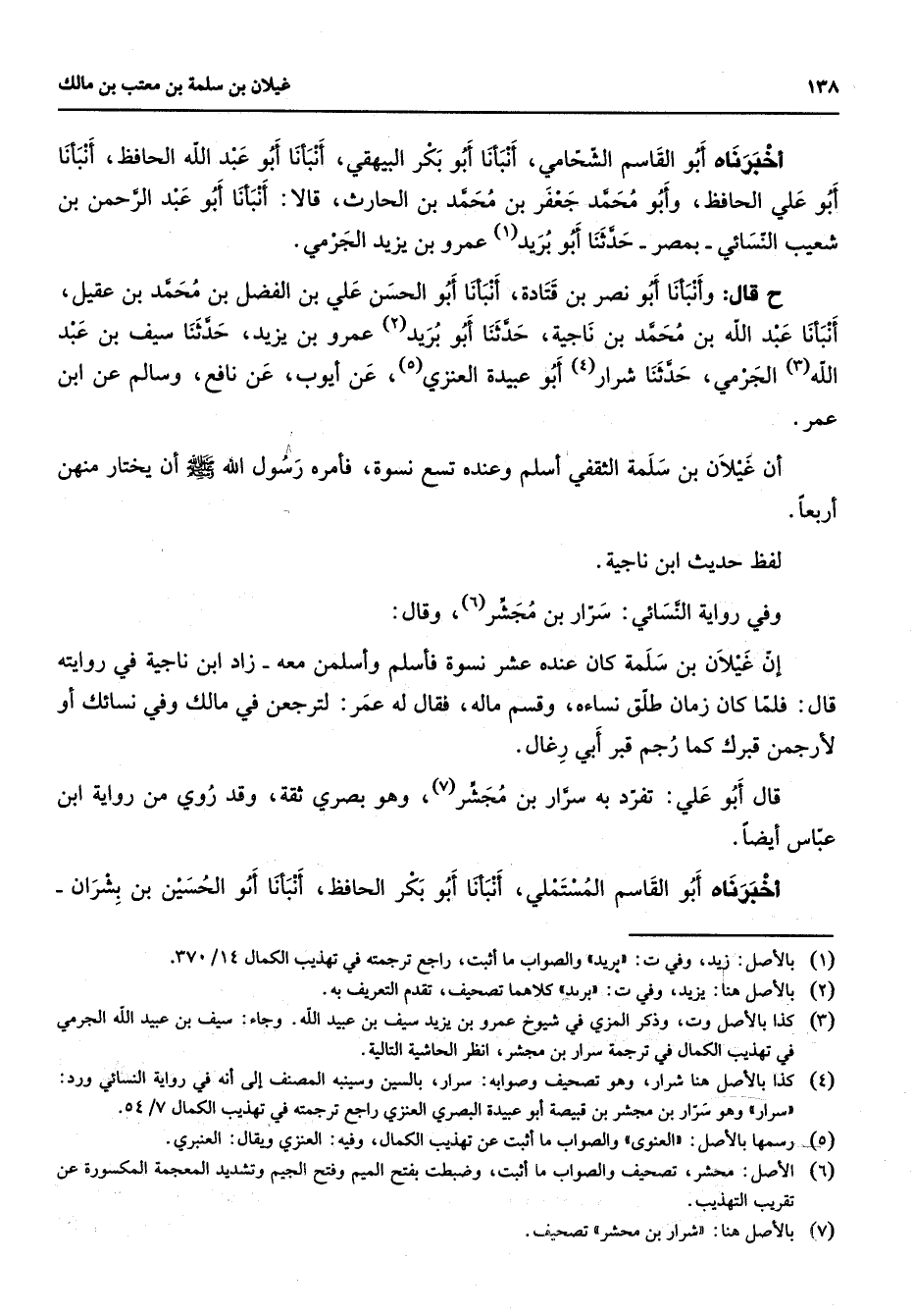 أخبرناه أبو القاسم الشحامي أنبأنا أبو بكر البيهقي أنبأنا أبو عبد الله الحافظ أنبأنا أبو علي الحافظ وأبو محمد جعفر بن محمد بن الحارث قالا أنبأنا أبو عبد الرحمن بن شعيب النسائي بمصر حدثنا أبو بريد (1) عمرو بن يزيد الجرمي ح قال وأنبأنا أبو نصر بن قتادة أنبأنا أبو الحسن علي بن الفضل بن محمد بن عقيل أنبأنا عبد الله بن محمد بن ناجية حدثنا أبو بريد (2) عمرو بن يزيد حدثنا سيف بن عبد الله (3) الجرمي حدثنا شرار (4) أبو عبيدة العنزي (5) عن أيوب عن نافع وسالم عن ابن عمر أن غيلان بن سلمة الثقفي أسلم وعنده تسع نسوة فأمره رسول الله (صلى الله عليه وسلم) أن يختار منهن أربعا لفظ حديث ابن ناجية وفي رواية النسائي سرار بن مجشر (6) وقال إن غيلان بن سلمة كان عنده عشر نسوة فأسلم وأسلمن معه زاد ابن ناجية في روايته قال فلما كان زمان طلق نساءه وقسم ماله فقال له عمر لترجعن في مالك وفي نسائك أو لأرجمن قبرك كما رجم قبر أبي رغال قال أبو علي تفرد به سرار بن مجشر (7) وهو بصري ثقة وقد روي من رواية ابن عباس أيضا أخبرناه أبو القاسم المستملي أنبأنا أبو بكر الحافظ أنبأنا أبو الحسين بن بشران