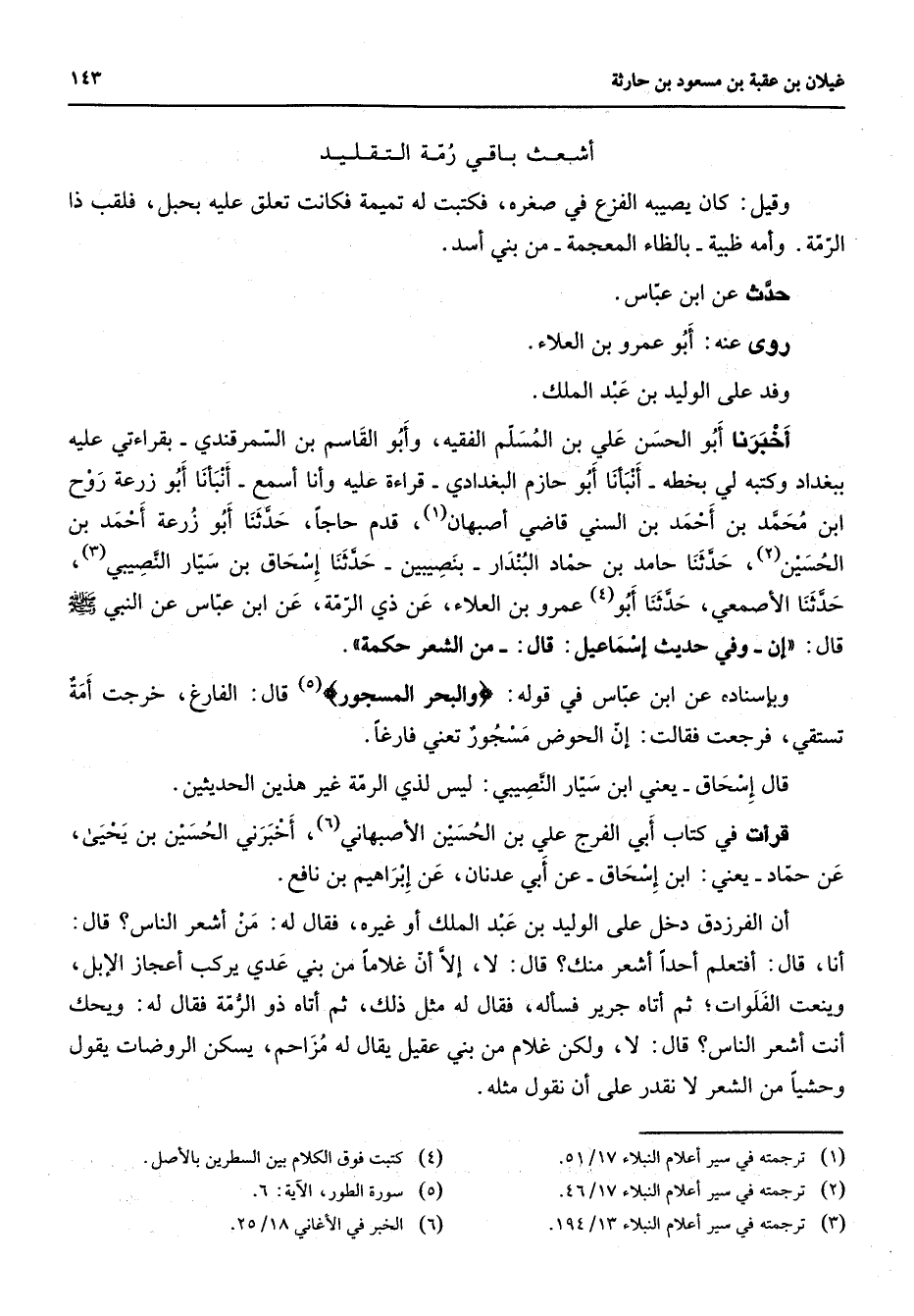 أشعث باقي رمة التقليد وقيل كان يصيبه الفزع في صغره فكتبت له تميمة فكانت تعلق عليه بحبل فلقب ذا الرمة وأمه ظبية بالظاء المعجمة من بني أسد حدث عن ابن عباس روى عنه أبو عمرو بن العلاء وفد على الوليد بن عبد الملك أخبرنا أبو الحسن علي بن المسلم الفقيه وأبو القاسم بن السمرقندي بقراءتي عليه ببغداد وكتبه لي بخطه أنبأنا أبو حازم البغدادي قراءة عليه وأنا اسمع أنبأنا أبو زرعة روح بن محمد بن أحمد بن السني قاضي أصبهان (1) قدم حاجا حدثنا أبو زرعة أحمد بن الحسين (2) حدثنا حامد بن حماد البندار بنصيبين حدثنا إسحاق بن سيار النصيبي (3) حدثنا الأصمعي حدثنا أبو (4) عمرو بن العلاء عن ذي الرمة عن ابن عباس عن النبي (صلى الله عليه وسلم) قال (إن وفي حديث إسماعيل قال من الشعر حكمة * وبإسناده عن ابن عباس في قوله " والبحر المسجور " (5) قال الفارغ خرجت أمة تستقي فرجعت فقالت إن الحوض مسجور تعني فارغا قال إسحاق يعني ابن سيار النصيبي ليس لذي الرمة غير هذين الحديثين قرأت في كتاب أبي الفرج علي بن الحسين الأصبهاني (6) أخبرني الحسين بن يحيى عن حماد يعني ابن إسحاق عن أبي عدنان عن إبراهيم بن نافع أن الفرزدق دخل على الوليد بن عبد الملك أو غيره فقال له من أشعر الناس قال أنا قال أفتعلم أحدا أشعر منك قال لا إلا أن غلاما من بني عدي يركب أعجاز الإبل وينعت الفلوات ثم أتاه جرير فسأله فقال له مثل ذلك ثم أتاه ذو الرمة فقال له ويحك أنت أشعر الناس قال لا ولكن غلام من بني عقيل يقال له مزاحم يسكن الروضات يقول وحشيا من الشعر لا نقدر على أن نقول مثله
