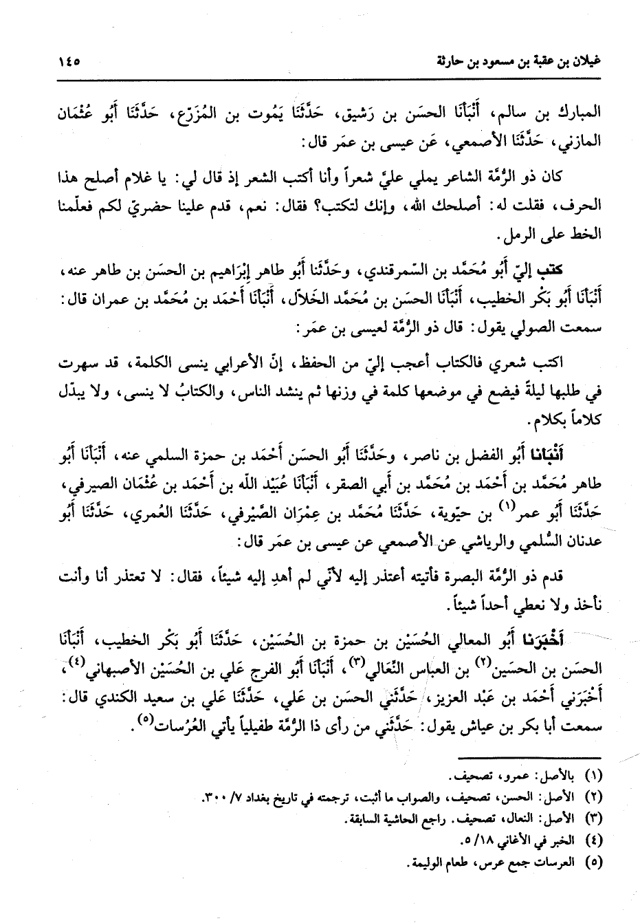 المبارك بن سالم أنبأنا الحسن بن رشيق حدثنا يموت بن المزرع حدثنا أبو عثمان المازني حدثنا الأصمعي عن عيسى بن عمر قال كان ذو الرمة الشاعر يملي علي شعرا وأنا أكتب الشعر إذ قال لي يا غلام أصلح هذا الحرف فقلت له أصلحك الله وإنك لتكتب فقال نعم قدم علينا حضري لكم فعملنا الخط على الرمل كتب إلي أبو محمد بن السمرقندي وحدثنا أبو طاهر إبراهيم بن الحسن بن طاهر عنه أنبأنا أبو بكر الخطيب أنبأنا الحسن بن محمد الخلال أنبأنا أحمد بن محمد بن عمران قال سمعت الصولي يقول قال ذو الرمة لعيسى بن عمر اكتب شعري فالكتاب أعجب إلي من الحفظ إن الأعرابي ينسى الكلمة قد سهرت في طلبها ليلة فيضع في موضعها كلمة في وزنها ثم ينشد الناس والكتاب لا ينسى ولا يبدل كلاما بكلام أنبأنا أبو الفضل بن ناصر وحدثنا أبو الحسن أحمد بن حمزة السلمي عنه أنبأنا أبو طاهر محمد بن أحمد بن محمد بن أبي الصقر أنبأنا عبيد الله بن أحمد بن عثمان الصيرفي حدثنا أبو عمر (1) بن حيوية حدثنا محمد بن عمران الصيرفي حدثنا العمري حدثنا أبو عدنان السلمي والرياشي عن الأصمعي عن عيسى بن عمر قال قدم ذو الرمة البصرة فأتيته أعتذر إليه لأني لم أهد إليه شيئا فقال لا تعتذر أنا وأنت نأخذ ولا نعطي أحدا شيئا أخبرنا أبو المعالي الحسين بن حمزة بن الحسين حدثنا أبو بكر الخطيب أنبأنا الحسن بن الحسين (2) بن العباس النعالي (3) أنبأنا أبو الفرج علي بن الحسين الأصبهاني (4) أخبرني أحمد بن عبد العزيز حدثني الحسن بن علي حدثنا علي بن سعيد الكندي قال سمعت أبا بكر بن عياش يقول حدثني من رأى ذا الرمة طفيليا يأتي العرسات