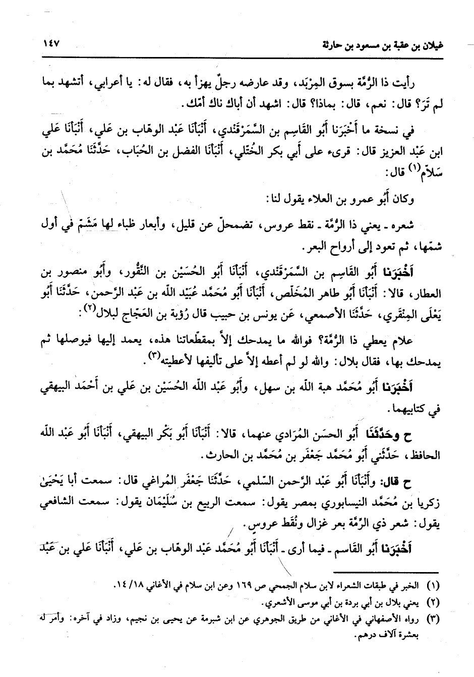 رأيت ذا الرمة بسوق المربد وقد عارضه رجل يهزأ به فقال له يا أعرابي أتشهد بما لم تر قال نعم قال بماذا قال أشهد أن أباك ناك أمك في نسخة ما أخبرنا أبو القاسم بن السمرقندي أنبأنا عبد الوهاب بن علي أنبأنا علي ابن عبد العزيز قال قرئ على أبي بكر الختلي أنبأنا الفضل بن الحباب حدثنا محمد بن سلام (1) قال وكان أبو عمرو بن العلاء يقول لنا شعره يعني ذا الرمة نقط عروس تضمحل عن قليل وأبعار ظباء لها مشم في أول شمها ثم تعود إلى أرواح البعر أخبرنا أبو القاسم بن السمرقندي أنبأنا أبو الحسين بن النقور وأبو منصور بن العطار قالا أنبأنا أبو طاهر المخلص أنبأنا أبو محمد عبيد الله بن عبد الرحمن حدثنا أبو يعلى المنقري حدثنا الأصمعي عن يونس بن حبيب قال رؤبة بن العجاج لبلال (2) علام يعطي ذا الرمة فوالله ما يمدحك إلا بمقطعاتنا هذه يعمد إليها فيوصلها ثم يمدحك بها فقال بلال والله لو لم أعطه إلا على تأليفها لأعطيته (3) أخبرنا أبو محمد هبة الله بن سهل وأبو عبد الله الحسين بن علي بن أحمد البيهقي في كتابيهما ح وحدثنا أبو الحسن المرادي عنهما قالا أنبأنا أبو بكر البيهقي أنبأنا أبو عبد الله الحافظ حدثني أبو محمد جعفر بن محمد بن الحارث ح قال وأنبأنا أبو عبد الرحمن السلمي حدثنا جعفر المراغي قال سمعت أبا يحيى زكريا بن محمد النيسابوري بمصر يقول سمعت الربيع بن سليمان يقول سمعت الشافعي يقول شعر ذي الرمة بعر غزال ونقط عروس أخبرنا أبو القاسم فيما أرى أنبأنا أبو محمد عبد الوهاب بن علي أنبأنا علي بن عبد
