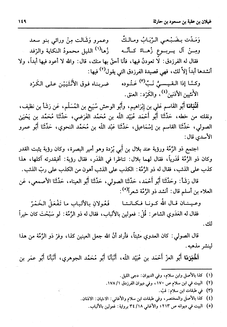 ومدت بضبعي الرباب ومالك * وعمرو وشالت من ورائي بنو سعد ومن آل يربوع زهاء كأنه * زها (1) الليل محمود النكاية والرفد * فقال له الفرزدق لا تعودن فيها فأنا أحق بها منك قال والله لاأعود فيها أبدا ولا أنشدها أبدا إلا لك فهي قصيدة الفرزدق التي يقول (2) فيها * وكنا إذا القيسي نب (3) عتوده * ضربناه فوق الأنثيين على الكرد * الأنثيين الأذنين (4) والكرد العنق أنبأنا أبو القاسم علي بن إبراهيم وأبو الوحش سبيع بن المسلم عن رشأ بن نظيف ونقلته من خطه حدثنا أبو أحمد عبيد الله بن محمد الفرضي حدثنا محمد بن يحيى الصولي حدثنا القاسم بن إسماعيل حدثنا عبد الله بن محمد النحوي حدثنا أبو عمرو الأسدي قال اجتمع ذو الرمة ورؤبة عند بلال بن أبي بردة وهو أمير البصرة وكان رؤبة يثبت القدر وكان ذو الرمة قدريا فقال لهما بلال تناظرا في القدر فقال رؤبة أفبقدرته آكلها هذا كذب على الذئب فقال له ذو الرمة الكذب على الذئب أهون من الكذب على رب الذئب قال رشأ وحدثنا أبو أحمد حدثنا الصولي حدثنا أبو العيناء حدثنا الأصمعي عن العلاء بن أسلم قال أنشد ذو الرمة شعرا (5) * وعينان قال الله كونا فكانتا * فعولان بالألباب ما تفعل الخمر * فقال له العدوي الشاعر قل فعولين بالألباب فقال له ذو الرمة لو سبحت كان خيرا لك قال الصولي كان العدوي مثبتا فأراد الله جعل العينين كذا وفر ذو الرمة من هذا لينشر مذهبه أخبرنا أبو العز أحمد بن عبيد الله أنبأنا أبو محمد الجوهري أنبأنا أبو عمر بن