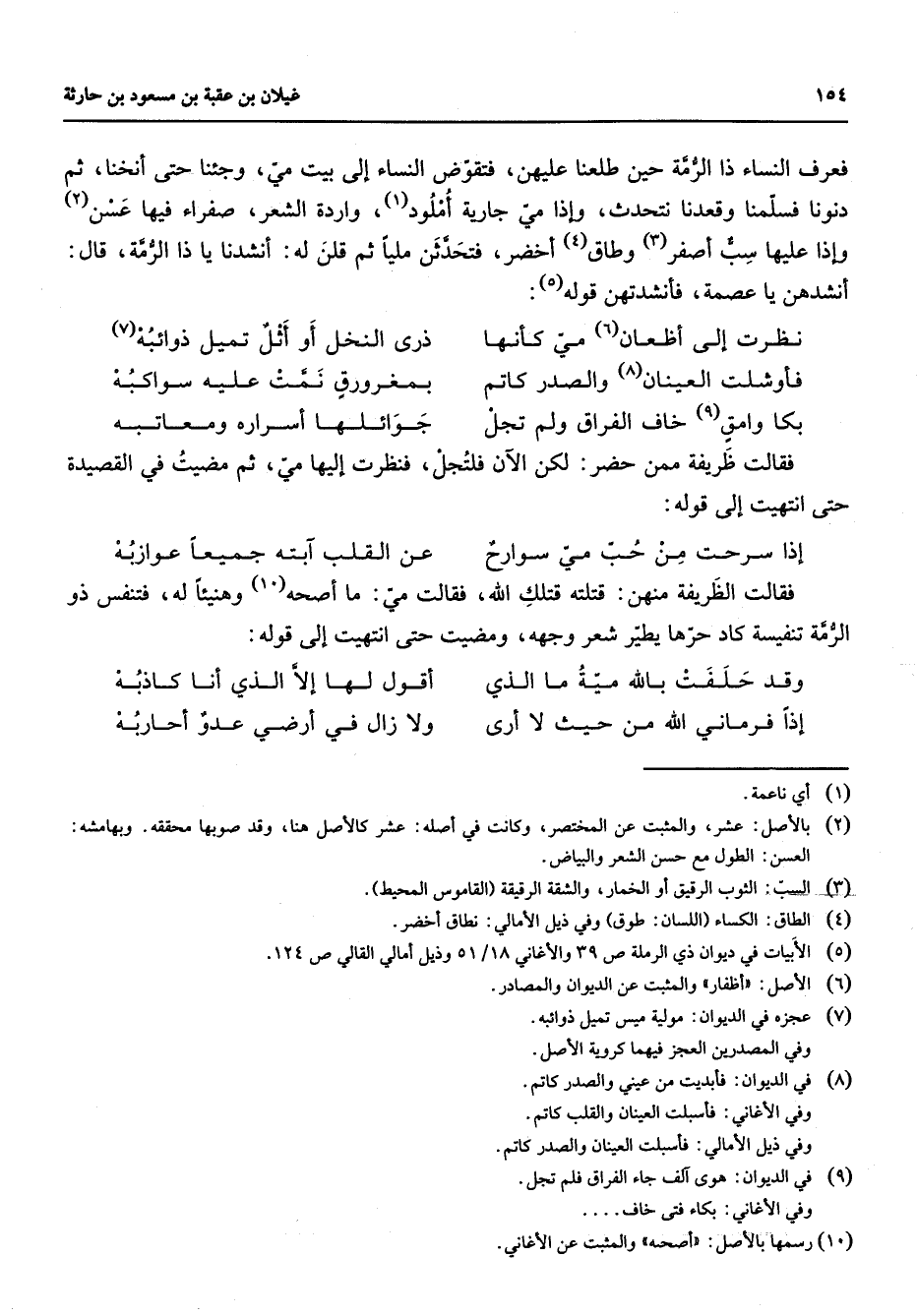 فعرف النساء ذا الرمة حين طلعنا عليهن فتقوض النساء إلى بيت مي وجئنا حتى أنخنا ثم دنونا فسلمنا وقعدنا نتحدث وإذا مي جارية أملود (1) واردة الشعر صفراء فيها عسن (2) وإذا عليها سب أصفر (3) وطاق (4) أخضر فتحدثن مليا قم قلن له أنشدنا يا ذا الرمة قال أنشدهن يا عصمة فأنشدتهن قوله (5) نظرت إلى أظعان (6) مي كأنها * ذرى النخل أو أثل تميل ذوائبه (7) فأوشلت العينان (8) والصدر كاتم * بمغرورق نمت عليه سواكبه بكا وامق (9) خاف الفراق ولم تجل * جوائلها أسراره ومعاتبه * فقالت ظريفة ممن حضر لكن الآن فلتجل فنظرت إليها مي ثم مضيت في القصيدة حتى انتهيت إلى قوله إذا سرحت من حب مي سوارح * عن القلب آبته جميعا عوازبه * فقالت الظريفة منهن قتلته قتلك الله فقالت مي ما أصحه (10) وهنيئا له فتنفس ذو الرمة تنفيسة كاد حرها يطير شعر وجهه ومضيت حتى انتهيت إلى قوله وقد حلفت بالله مية ما الذي * أقول لها إلا الذي أنا كاذبه إذا فرماني الله من حيث لا أرى * ولا أزال في أرضي عدو أحاربه