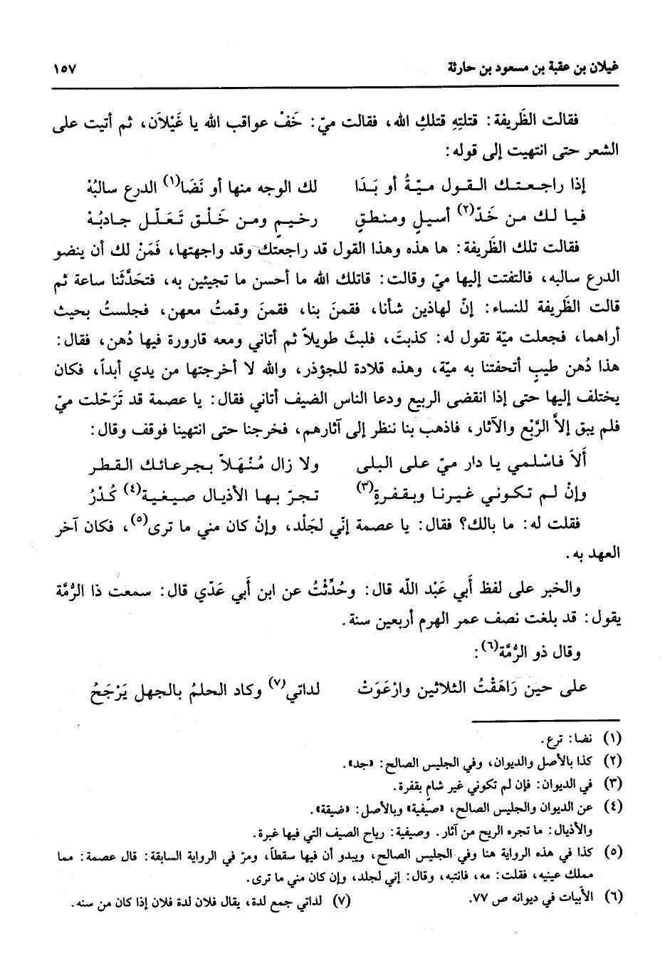 فقالت الظريفة قتلته قتلك الله فقالت مي خف عواقب الله يا غيلان ثم أتيت على الشعر حتى انتهيت إلى قوله إذا راجعتك القول مية أو بدا * لك الوجه منها أو نضا (1) الدرع سالبه * * فيا لك من خد (2) أسيل ومنطق * رخيم ومن خلق تعلل جادبه * فقالت تلك الظريفة ها هذه وهذا القول قد راجعتك وقد واجهتها فمن لك أن ينضو الدرع سالبه فالتفتت إليها مي وقالت قاتلك الله ما أحسن ما تجيئين به فتحدثنا ساعة ثم قالت الظريفة للنساء إن لهذين شأنا فقمن بنا فقمن وقمت معهن فجلست بحيث أراهما فجعلت مية تقول له كذبت فلبث طويلا ثم اتاني ومعه قارورة فيها دهن فقال هذا دهن طيب أتحفتنا به مية وهذه قلاده للجؤذر والله لا أخرجتها من يدي أبدا فكان يختلف إليها حتى إذا انقضى الربيع ودعا الناس الضيف أتاني فقال يا عصمة قد ترحلت مي فلم يبق إلا الربع والآثار فاذهب بنا ننظر إلى آثارهم فخرجنا حتى انتهينا فوقف وقال ألا فاسلمي يا دار مي على البلى * ولا زال منهلا بجرعائك القطر وإن لم تكوني غيرنا وبقفرة (3) * تجر بها الأذيال صيغية (4) كدر * فقلت له ما بالك فقال يا عصمة إني لجلد وإن كان مني ما ترى (5) فكان آخر العهد به والخبر على لفظ أبي عبد الله قال وحدثت عن ابن أبي عدي قال سمعت ذا الرمة يقول قد بلغت نصف عمر الهرم أربعين سنة وقال ذو الرمة (6) * على حين راهقت الثلاثين وارعوت * لداتي (7) وكاد الحلم بالجهل يرجح