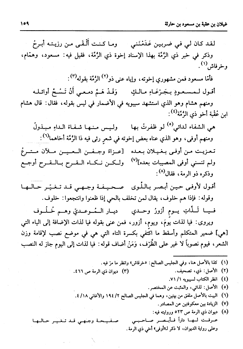 (8) ديوان ذي الرمة ص 523 وروايته فيه: عرفت لها دارا فأبصر صاحبي * صفيحة وجهي قد تغير حالها وعلى رواية الديوان لا ذكر ل " أوفى " أخي ذي الرمة