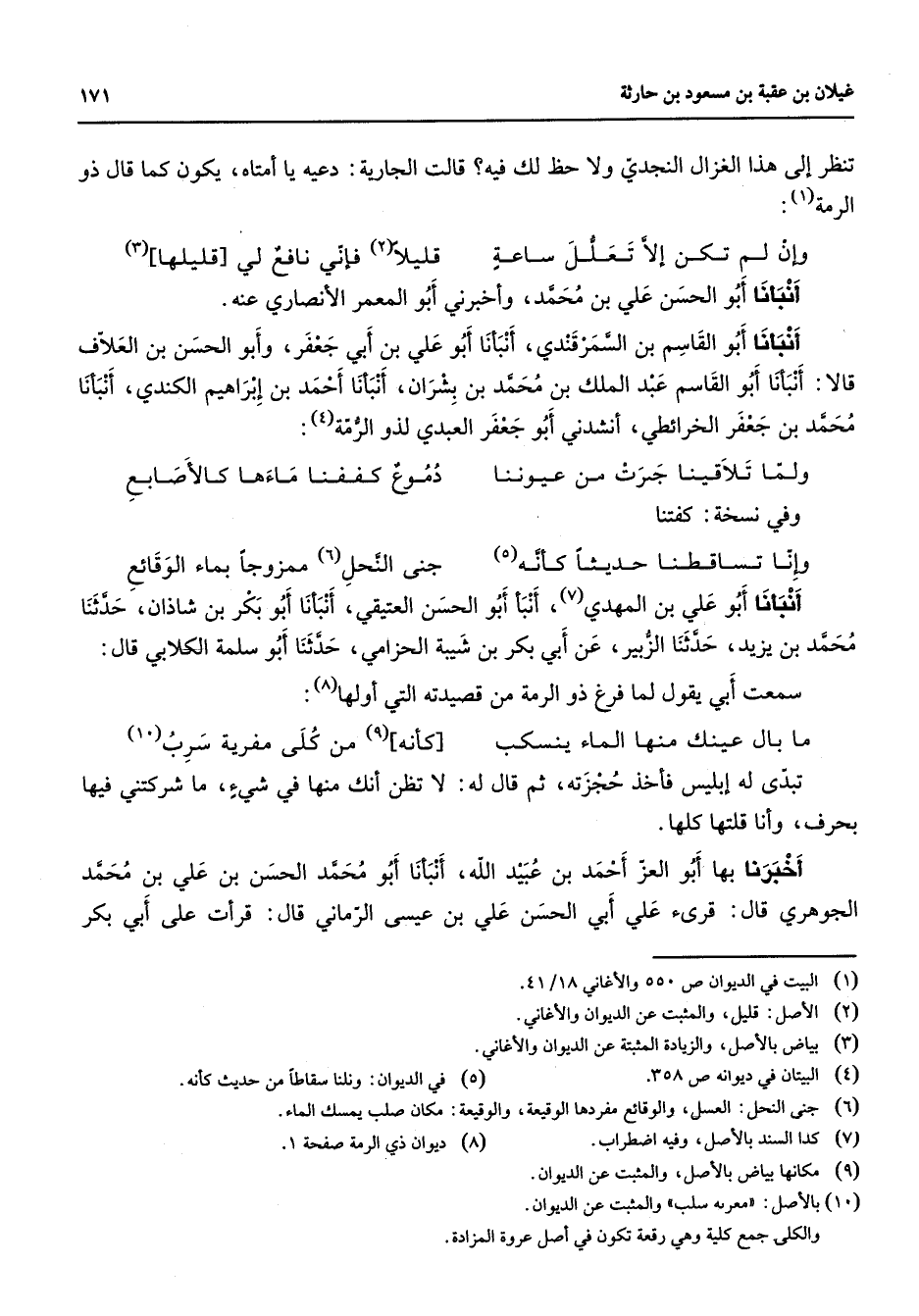 تنظر إلى هذا الغزال النجدي ولا حظ لك فيه قالت الجارية دعيه يا أمتاه يكون كما قال ذو الرمة (1) * وإن لم تكن إلا تعلل ساعة * قليلا (2) فإني نافع لي قليلها (3) * أنبأنا أبو الحسن علي بن محمد وأخبرني أبو المعمر الأنصاري عنه أنبأنا أبو القاسم بن السمرقندي أنبأنا أبو علي بن أبي جعفر وأبو الحسن بن العلاف قالا أنبأنا أبو القاسم عبد الملك بن محمد بن بشران أنبأنا أحمد بن إبراهيم الكندي أنبأنا محمد بن جعفر الخرائطي أنشدني أبو جعفر العبدي لذو الرمة (4) * ولما تلاقينا جرت من عيوننا * دموع كففنا ماءها كالأصابع * وفي نسخة كفتنا وإنا تساقطنا حديثا كأنه (5) * جنى النحل (6) ممزوجا بماء الوقائع * أنبأنا أبو علي بن المهدي (7) أنبأ أبو الحسن العتيقي أنبأنا أبو بكر بن شاذان حدثنا محمد بن يزيد حدثنا الزبير عن أبي بكر بن شيبة الحزامي حدثنا أبو سلمة الكلابي قال سمعت أبي يقول لما فرغ ذو الرمة من قصيدته التي أولها (8) * ما بال عينك منها الماء ينسكب * كأنه (9) من كلى مفرية سرب (10) * تبدى له إبليس فأخذ حجزته ثم قال له لا تظن أنك منها في شئ ما شركتني فيها بحرف وأنا قلتها كلها أخبرنا بها أبو العز أحمد بن عبيد الله أنبأنا أبو محمد الحسن بن علي بن محمد الجوهري قال قرئ علي أبي الحسن علي بن عيسى الرماني قال قرأت على أبي بكر