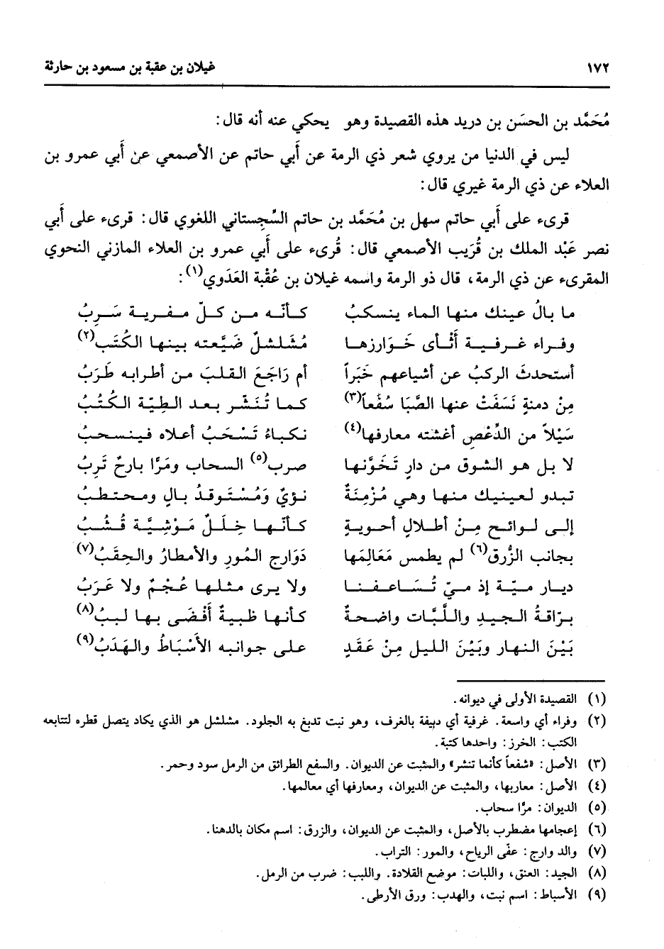 محمد بن الحسن بن دريد هذه القصيدة وهو يحكي عنه أنه قال ليس في الدنيا من يروي شعر ذي الرمة عن أبي حاتم عن الأصمعي عن أبي عمرو بن العلاء عن ذي الرمة غيري قال قرئ على أبي حاتم سهل بن محمد بن حاتم السجستاني اللغوي قال قرئ على أبي نصر عبد الملك بن قريب الأصمعي قال قرئ على أبي عمرو بن العلاء المازني النحوي المقرئ عن ذي الرمة واسمه غيلان بن عقبة العدوي (1) * ما بال عينك منها الماء ينسكب * كأنه من كل مفرية سرب وفراء غرفية أثأى خوارزها * مشلشل ضيعته بينها الكتب (2) أستحدث الركب عن أشياعهم خبرا * أم راجع القلب من أطرابه طرب من دمنة نسفت عنها الصبا سفعا (3) * كما تنشر بعد الطية الكتب سيلا من الدعص أغشته معارفها (4) * نكباء تسحب أعلاه فينسحب لا بل هو الشوق من دار تخونها * صرب (5) السحاب ومرا بارح ترب تبدو لعينيك منها وهي مزمنة * نؤي ومستوقد بال ومحتطب إلى لوائح من أطلال أحوية * كأنها خلل موشية قشب * بجانب الزرق (6) لم يطمس معالمها * دوارج المور والأمطار والحقب (7) * * ديار مية إذ مي تساعفنا * ولا يرى مثلها عجم ولا عرب براقة الجيد واللبات واضحة * كأنها ظبية أفضى بها لبب (8) بين النهار وبين الليل من عقد * على جوانبه الأسباط والهدب