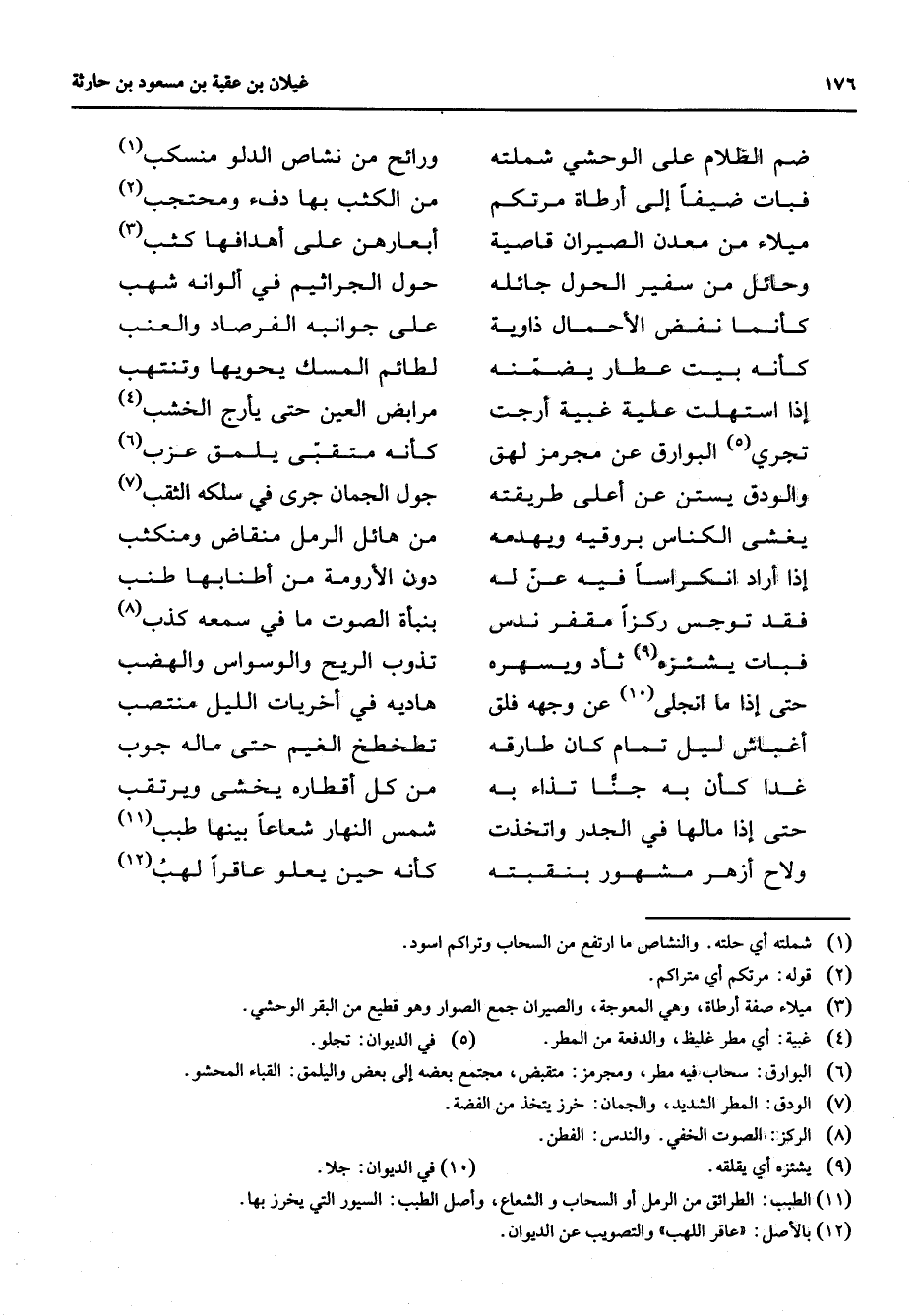 ضم الظلام على الوحشي شملته * ورائح من نشاص الدلو منسكب (1) فبات ضيفا إلى أرطاة مرتكم * من الكثب بها دفء ومحتجب (2) ميلاء من معدان الصيران قاصية * أبعارهن على أهدافها كثب (3) وحائل من سفير الحول جائله * حول الجراثيم في ألوانه شهب كأنما نفض الأحمال ذاوية * على جوانبه الفرصاد والعنب كأنه بيت عطار يضمنه * لطائم المسك يحويها وتنتهب إذا استهلت علية غبية أرجت * مرابض العين حتى يأرج الخشب (4) تجري (5) البوارق عن مجرمز لهق * كأنه متقبى يلمق عزب (6) والودق يستن عن أعلى طريقته * جول الجمان جرى في سلكه الثقب (7) يغشى الكناس بروقيه ويهدمه * من هائل الرمل منقاض ومنكثب إذا أراد انكراسا فيه عن له * دون الأرومة من أطنابها طنب فقد توجس ركزا مقفر ندس * بنبأة الصوت ما في سمعه كذب (8) فبات يشئزه (9) ثأد ويسهره * تذوب الريح والوسواس والهضب حتى إذا ما انجلى (10) عن وجهه فلق * هاديه في أخريات الليل منتصب أغباش ليل تمام كان طارقه * تطخطخ الغيم حتى ماله جوب غدا كأن به جنا تذاء به * من كل أقطاره يخشى ويرتقب حتى إذا مالها في الجدر واتخذت * شمس النهار شعاعا بينها طبب (11) ولاح أزهر مشهور بنقبته * كأنه حين يعلو عاقرا لهب (12)