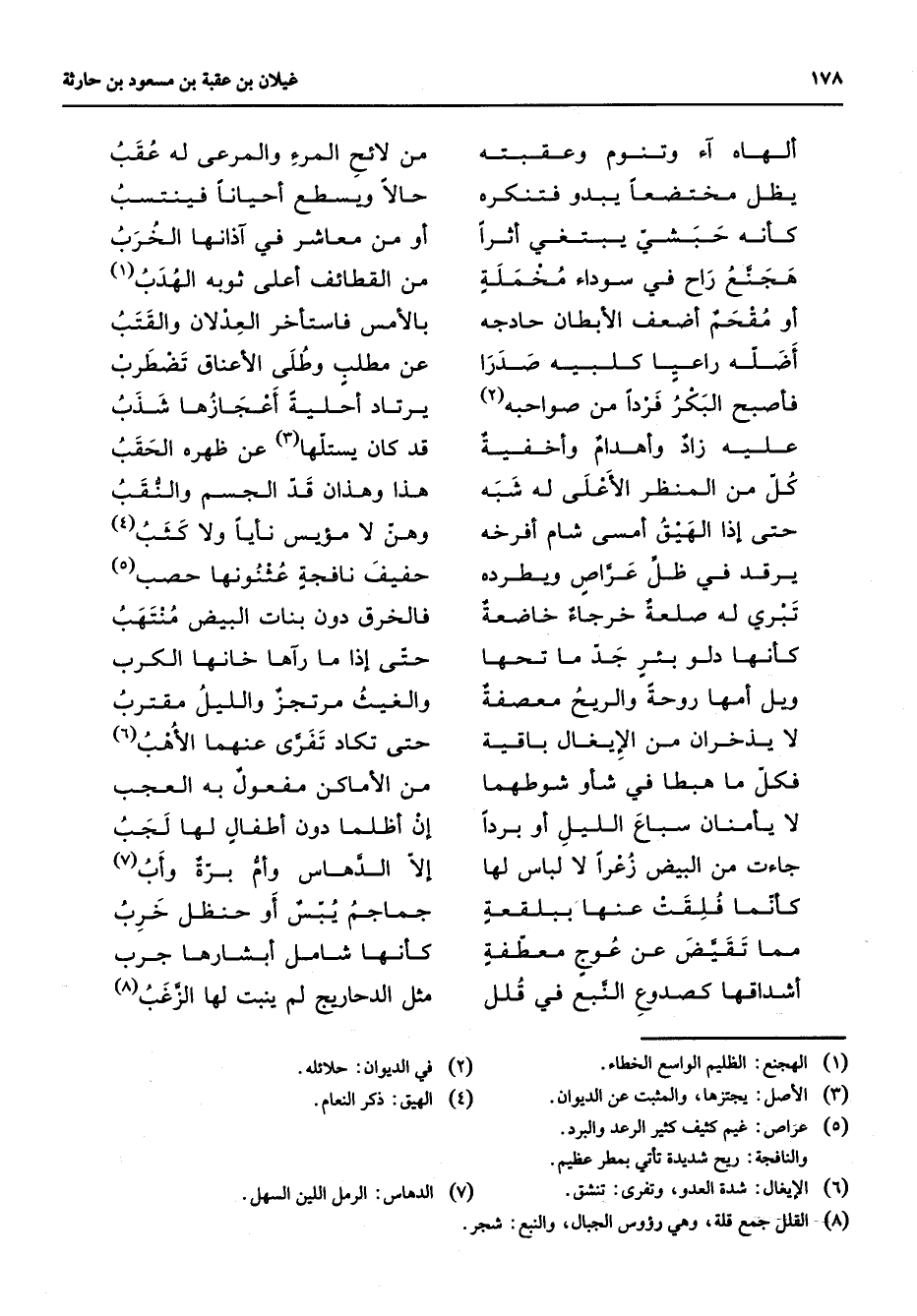 ألهاه آء وتنوم وعقبته * من لائح المرء والمرعى له عقب يظل مختصعا يبدو فتنكره * حالا ويسطع أحيانا فينتسب كأنه حبشي يبتغي أثرا * أو من معاشر في آذانها الخرب هجنع راح في سوداء مخملة * من القطائف أعلى ثوبه الهدب (1) أو مقحم أضعف الأبطان حادجه * بالأمس فاستأخر العدلان والقتب أضله راعيا كلبيه صدرا * عن مطلب وطلى الأعناق تضطرب فأصبح البكر فردا من صواحبه (2) * يرتاد أحلية أعجازها شذب عليه زاد وأهدام وأخفية * قد كان يستلها (3) عن ظهره الحقب كل من المنظر الأعلى له شبه * هذا وهذان قد الجسم والنقب حتى إذا الهيق أمسى شام أفرخه * وهن لا مؤيس نأيا ولا كثب (4) يرقد في ظل عراص ويطرده * حفيف نافجة عثنونها حصب (5) تبري له صلعة خرجاء خاصعة * فالخرق دون بنات البيض منتهب كأنها دلو بئر جد ما تحها * حتى إذا ما رآها خانها الكرب ويل أمها روحة والريح معصفة * والغيث مرتجز والليل مقترب لا يذخران من الإيغال باقية * حتى تكاد تفرى عنهما الأهب فكل ما هبطا في شأو شوطهما * من الأماكن مفعول به العجب لا يأمنان سباع الليل أو بردا * إن أظلما دون أطفال لها لجب جاءت من البيض زعرا لا لباس لها * إلا الدهاس وأم برة وأب (7) كأنما فلقت عنها ببلقعة * جماجم يبس أو حنظل خرب مما تقيض عن عوج معطفة * كأنها شامل أبشارها جرب أشداقها كصدوع النبع في قلل * مثل الدحاريج لم ينبت لها الزغب * (8)