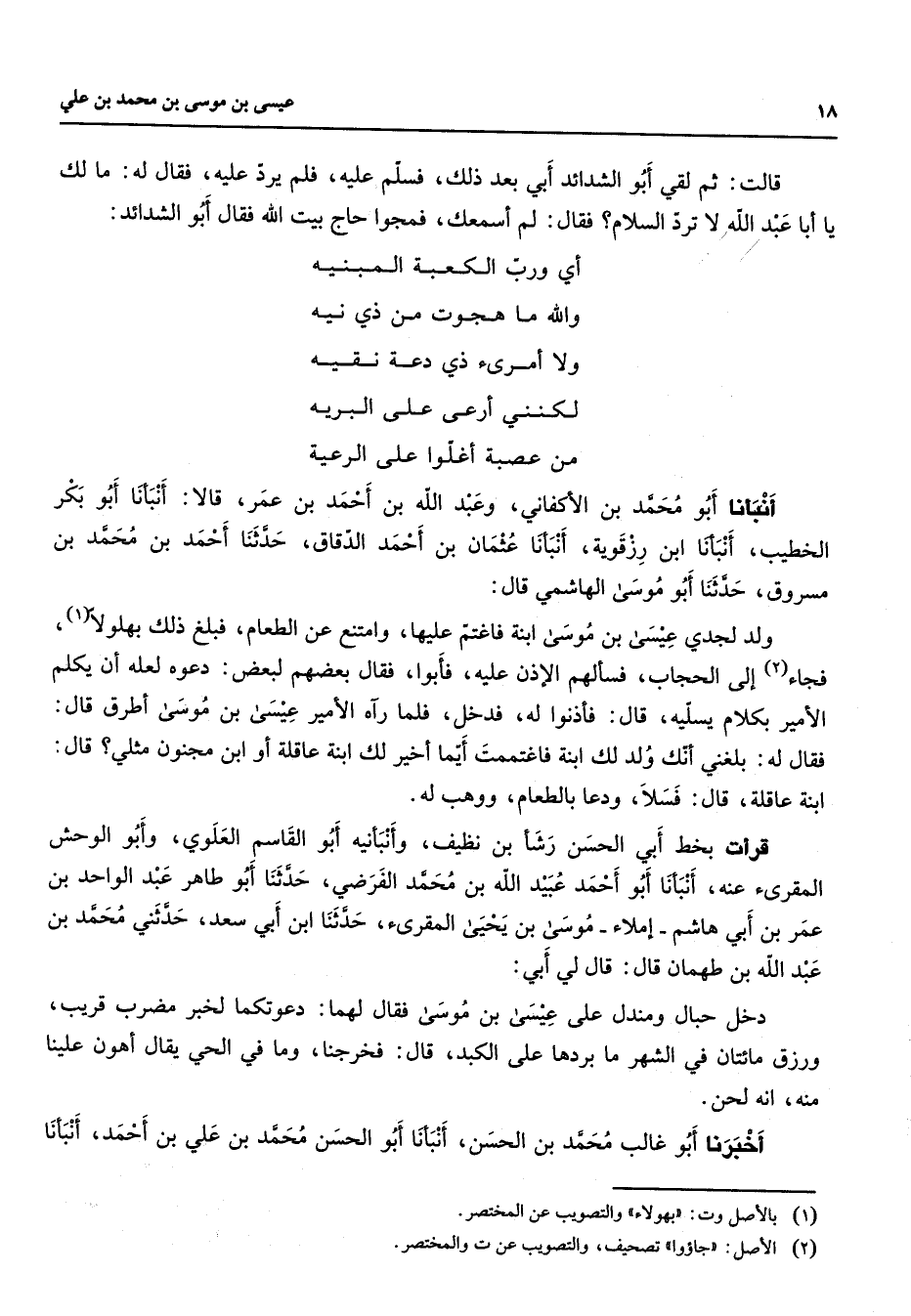 قالت ثم لقي أبو الشدائد أبي بعد ذلك فسلم عليه فلم يرد عليه فقال له مالك يا أبا عبد الله لا ترد السلام فقال لم أسمعك فمجوا حاج بيت الله فقال أبو الشدائد أي ورب الكعبة المبنية * والله ما هجوت من ذي نية * ولا امرئ ذي دعة نقية * لكنني أرعى على البرية * من عصبة أغلوا على الرعية أنبأنا أبو محمد بن الأكفاني وعبد الله بن أحمد بن عمر قالا أنبأنا أبو بكر الخطيب أنبأنا ابن رزقويه أنبأنا عثمان بن أحمد الدقاق حدثنا أحمد بن محمد بن مسروق حدثنا أبو موسى الهاشمي قال ولد لجدي عيسى بن موسى ابنة فاغتم عليها وامتنع عن الطعام فبلغ ذلك بهلولا (1) فجاء (2) إلى الحجاب فسألهم الإذن عليه فأبوا فقال بعضهم لبعض دعوه لعله أن يكلم الأمير بكلام يسليه قال فأذنوا له فدخل فلما رآه الأمير عيسى بن موسى أطرق قال فقال له بلغني أنك ولد لك ابنة فاغتممت أيما خير لك ابنة عاقلة أو ابن مجنون مثلي قال ابنة عاقلة قال فسلا ودعا بالطعام ووهب له قرأت بخط أبي الحسن رشأ بن نظيف وأنبأنيه أبو القاسم العلوي وأبو الوحش المقرئ عنه أنبأنا أبو أحمد عبيد الله بن محمد الفرضي حدثنا أبو طاهر عبد الواحد بن عمر بن أبي هاشم إملاء موسى بن يحيى المقرئ حدثنا ابن أبي سعد حدثني محمد بن عبد الله بن طهمان قال قال لي أبي دخل حبال ومندل على عيسى بن موسى فقال لهما دعوتكما لخبر مضرب قريب ورزق مائتان في الشهر ما بردها على الكبد قال فخرجنا وما في الحي يقال أهون علينا منه أنه لحن أخبرنا أبو غالب محمد بن الحسن أنبأنا أبو الحسن محمد بن علي بن أحمد أنبأنا