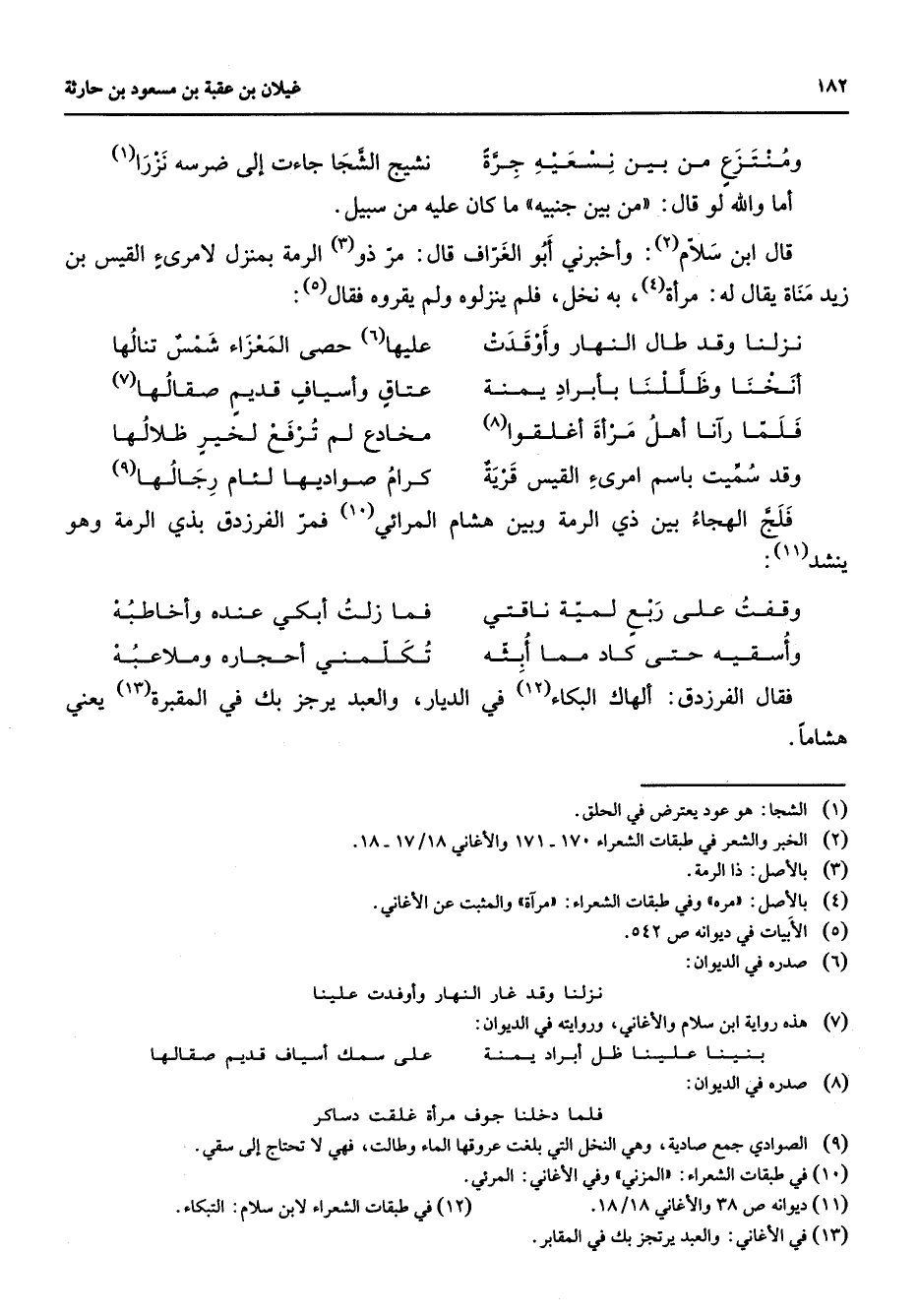 (6) صدره في الديوان: نزلنا وقد غار النهار وأوفدت علينا (7) هذه رواية ابن سلام والاغاني وروايته في الديوان: بنينا علينا ظل أبراد يمنة * على سمك أسياف قديم صقالها (8) صدره في الديوان: فلما دخلنا جوف مرأة غلقت دساكر (9) الصوادي جمع صادية وهي النخل التي بلغت عروقها الماء وطالت فهي لا تحتاج إلى سقي