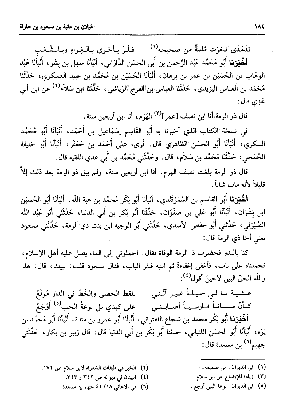 تدهدى فخرت ثلمة من صحيحه (1) * فلز بأخرى بالغراء وبالشغب * أخبرنا أبو محمد عبد الرحمن بن أبي الحسن الداراني أنبأنا سهل بن بشر أنبأنا عبد الوهاب بن الحسين بن عمر بن برهان أنبأنا الحسين بن محمد بن عبيد العسكري حدثنا محمد بن العباس اليزيدي حدثنا العباس بن الفرج الرياشي حدثنا ابن سلام (2) عن ابن أبي عدي قال قال ذو الرمة أنا ابن نصف عمر (3) الهرم أنا ابن أربعين سنة في نسخة الكتاب الذي أخبرنا به أبو القاسم إسماعيل بن أحمد أنبأنا أبو محمد السكري أنبأنا أبو الحسن الظاهري قال قرئ على أحمد بن جعفر أنبأنا أبو خليفة الجمحي حدثنا محمد بن سلام قال وحدثني محمد بن أبي عدي الفقيه قال قال ذوالرمة بلغت نصف الهرم أنا ابن أربعين سنة ولم يبق ذو الرمة بعد ذلك إلا قليلا لأنه مات شابا أخبرنا أبو القاسم بن السمرقندي أنبأنا أبو بكر محمد بن هبة الله أنبأنا أبو الحسين ابن بشران أنبأنا أبو علي بن صفوان حدثنا أبو بكر بن أبي الدنيا حدثني أبو عبد الله الصيرفي حدثني أبو حفص الأسدي حدثني أبو الوجيه ابن بنت ذي الرمة حدثني مسعود يعني أخا ذي الرمة قال كنا بالبدو فحضرت ذا الرمة الوفاة فقال احملوني إلى الماء يصل عليه أهل الإسلام فحملناه على باب فأغفى إغفاءة ثم انتبه فنقر الباب فقال مسعود قلت لبيك قال هذا والله الحق البين لاحين أقول (4) * عشية ما لي حيلة غير أنني * بلقط الحصى والخط في الدار مولع كأن سنانا فارسيا أصابني * على كبدي بل لوعة الحب (5) أوجع * أخبرنا أبو بكر محمد بن شجاع اللفتواني أنبأنا أبو عمرو بن مندة أنبأنا أبو محمد بن يوه أنبأنا أبو الحسن اللنباني حدثنا أبو بكر بن أبي الدنيا قال قال زبير بن بكار حدثني جهيم (6) بن مسعدة قال