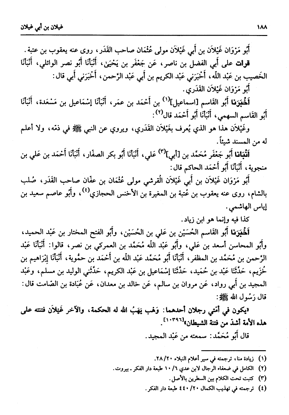 أبو مروان غيلان بن أبي غيلان مولى عثمان صاحب القدر روى عنه يعقوب بن عتبة قرأت على أبي الفضل بن ناصر عن جعفر بن يحيى أنبأنا أبو نصر الوائلي أنبأنا الخصيب بن عبد الله أخبرني عبد الكريم بن أبي عبد الرحمن أخبرني أبي قال أبو مروان غيلان القدري أخبرنا أبو القاسم إسماعيل (1) بن أحمد بن عمر أنبأنا إسماعيل بن مسعدة أنبأنا أبو القاسم السهمي أنبأنا أبو أحمد قال (2) وغيلان هذا هو الذي يعرف بغيلان القدري ويروي عن النبي (صلى الله عليه وسلم) في ذمة ولا أعلم له من المسند شيئا أنبأنا أبو جعفر محمد بن أبي (3) علي أنبأنا أبو بكر الصفار أنبأنا أحمد بن علي بن منجوية أنبأنا أبو أحمد الحاكم قال أبو مروان غيلان بن أبي غيلان القرشي مولى عثمان بن عفان صاحب القدر صلب بالشام روى عنه يعقوب بن عتبة بن المغيرة بن الأخنس الحجازي (4) وأبو عاصم سعيد بن إياس الهاشمي كذا فيه وإنما هو ابن زياد أخبرنا أبو القاسم الحسين بن علي بن الحسين وأبو الفتح المختار بن عبد الحميد وأبو المحاسن أسعد بن علي وأبو عبد الله محمد بن العمركي بن نصر قالوا أنبأنا عبد الرحمن بن محمد بن المظفر أنبأنا أبو محمد عبد الله بن أحمد بن حموية أنبأنا إبراهيم بن خزيم حدثنا عبد بن حميد حدثنا إسماعيل بن عبد الكريم حدثني الوليد بن مسلم وعبد المجيد بن أبي رواد عن مروان بن سالم عن خالد بن معدان عن عبادة بن الصامت قال قال رسول الله (صلى الله عليه وسلم) يكون في أمتي رجلان أحدهما وهب يهب الله له الحكمة والآخر غيلان فتنته على هذه الأمة أشد من فتنة الشيطان قال أبو محمد سمعته من عبد المجيد