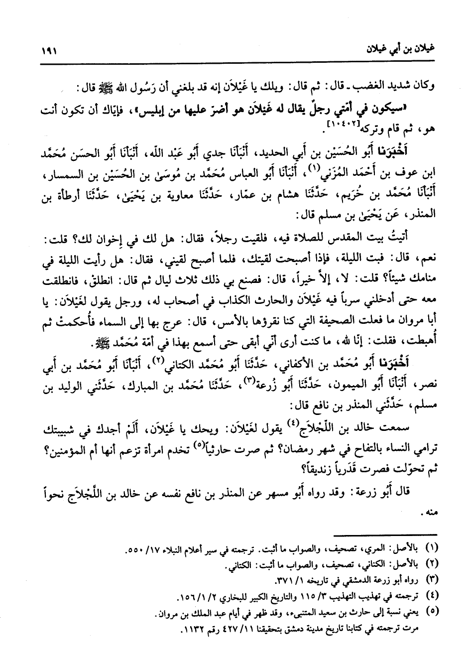 وكان شديد الغضب قال ثم قال ويلك ياغيلان إنه قد بلغني أن رسول الله (صلى الله عليه وسلم) قال سيكون في أمتي رجل يقال له غيلان هو أضر عليها من إبليس فإياك أن تكون أنت هو ثم قام وتركه أخبرنا أبو الحسين بن أبي الحديد أنبأنا جدي أبو عبد الله أنبأنا أبو الحسن محمد ابن عوف بن أحمد المزني (1) أنبأنا أبو العباس محمد بن موسى بن الحسين بن السمسار أنبأنا محمد بن خريم حدثنا هشام بن عمار حدثنا معاوية بن يحيى حدثنا أرطأة بن المنذر عن يحيى مسلم قال أتيت بيت المقدس للصلاة فيه فلقيت رجلا فقال هل لك في إخوان لك قلت نعم قال فبت الليلة فإذا أصبحت لقيتك فلما أصبح لقيني فقال هل رأيت الليلة في منامك شيئا قلت لا إلا خيرا قال فصنع بي ذلك ثلاث ليال ثم قال انطلق فانطلقت معه حتى أدخلني سربا فيه غيلان والحارث الكذاب في أصحاب له ورجل يقول لغيلان يا أبا مروان ما فعلت الصحيفة التي كنا نقرؤها بالأمس قال عرج بها إلى السماء فأحكمت ثم أهبطت فقلت إنا لله ما كنت أرى أني أبقى حتى أسمع بهذا في أمة محمد (صلى الله عليه وسلم) أخبرنا أبو محمد بن الأكفاني حدثنا أبو محمد الكتاني (2) أنبأنا أبو محمد بن أبي نصر أنبأنا أبو الميمون حدثنا أبو زرعة (3) حدثنا محمد بن المبارك حدثني الوليد بن مسلم حدثني المنذر بن نافع قال سمعت خالد بن اللجلاج (4) يقول لغيلان ويحك يا غيلان ألم أجدك في شبيبتك ترامي النساء بالتفاح في شهر رمضان ثم صرت حارثيا (5) تخدم امرأة تزعم أنها أم المؤمنين؟ ثم تحولت فصرت قدريا زنديقا قال أبو زرعة وقد رواه أبو مسهر عن المنذر بن نافع نفسه عن خالد بن اللجلاج نحوا منه