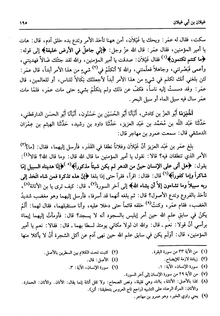 " " سكت فقال له عمر ويحك يا غيلان أمن ههنا تأخذ الأمر وتدع بدء خلق آدم قال هات يا أمير المؤمنين فقال عمر قال الله عز وجل " إني جاعل في الأرض خليفة " إلى قوله ما كنتم تكتمون " فقال غيلان صدقت يا أمير المؤمنين والله لقد جئتك ضالا فهديتني وأعمى فبصرتني وجاهلا فعلمتني والله لا أتكلم في (2) شئ من هذا الأمر أبدا قال عمر لئن بلغني أنك تكلم في شئ من هذا الأمر أبدا لأجعلنك نكالا للناس أو للعالمين قال عمر وقد دسست إليه ناسا فكف عن ذلك ولم يتكلم بشئ حتى مات عمر فلما مات عمر سال فيه سيل الماء أو سيل البحر " أخبرنا أبو العز بن كادش أنبأنا أبو الحسين بن حسنون أنبأنا أبو الحسن الدارقطني حدثنا عبد الله بن محمد بن عبد العزيز حدثنا داود بن رشيد حدثنا الهيثم بن عمران الدمشقي قال سمعت عمرو بن مهاجر قال بلغ عمر بن عبد العزيز أن غيلان وفلانا نطقا في القدر فأرسل إليهما فقال ما (3) الأمر الذي تنطقان فيه قالا نقول يا أمير المؤمنين ما قال الله قال وما قال الله قالا (4) يقول " هل أتى على الإنسان حين من الدهر لم يكن شيئا مذكورا " (5) " إنا هديناه السبيل إما شاكرا وإما كفورا " (6) قال فقال اقرآ فقرآ حتى إذا بلغا " إن هذه تذكرة فمن شاء اتخذ إلى ربه سبيلا وما تشاءون إلا أن يشاء الله " إلى آخر السورة (7) قال كيف ترى يا بن الأتانة (8) تأخذ بالفروع وتدع الأصول قال ثم بلغه أنهما قد أسرفا فأرسل إليهما وهو مغضب شديد الغضب فقام عمر وكنت (9) خلفه قائما حتى دخلا عليه وأنا مستقبلهما فقال لهما ألم يكن في سابق علم الله حين أمر إبليس بالسجود أنه لا يسجد قال فأومأت إليهما إيماء برأسي أن قولا نعم قال والله ان لولا مكاني يومئذ لسطا بهما قال فقالا نعم يا أمير المؤمنين قال أولم يكن في سابق علم الله حين نهى آدم عن أكل الشجرة أن لا يأكلا منها