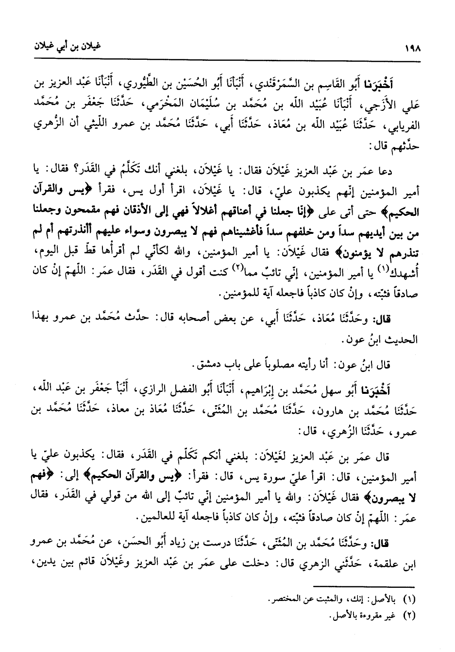 أخبرنا أبو القاسم بن السمرقندي أنبأنا أبو الحسين بن الطيوري أنبأنا عبد العزيز بن علي الأزجي أنبأنا عبيد الله بن محمد بن سليمان المخرمي حدثنا جعفر بن محمد الفريابي حدثنا عبيد الله بن معاذ حدثنا أبي حدثنا محمد بن عمرو الليثي أن الزهري حدثهم قال دعا عمر بن عبد العزيز غيلان فقال يا غيلان بلغني أنك تكلم في القدر فقال يا أمير المؤمنين إنهم يكذبون علي قال يا غيلان اقرأ أول يس فقرأ " يس والقرآن الحكيم " حتى أتى على " إنا جعلنا في أعناقهم أغلالا فهي إلى الأذقان فهم مقمحون وجعلنا من بين أيديهم سدا ومن خلفهم سدا فأغشيناهم فهم لا يبصرون وسواء عليهم أأنذرتهم أم لم تنذرهم لا يؤمنون " فقال غيلان يا أمير المؤمنين والله لكأني لم أقرأها قط قبل اليوم أشهدك (1) يا أمير المؤمنين إني تائب مما (2) كنت أقول في القدر فقال عمر اللهم إن كان صادقا فثبته وإن كان كاذبا فاجعله آية للمؤمنين قال وحدثنا معاذ حدثنا أبي عن بعض أصحابه قال حدث محمد بن عمرو بهذا الحديث ابن عون قال ابن عون أنا رأيته مصلوبا على باب دمشق أخبرنا أبو سهل محمد بن إبراهيم أنبأنا أبو الفضل الرازي أنبأ جعفر بن عبد الله حدثنا محمد بن هارون حدثنا محمد بن المثنى حدثنا معاذ بن معاذ حدثنا محمد بن عمرو حدثنا الزهري قال قال عمر بن عبد العزيز لغيلان بلغني أنكم تكلم في القدر فقال يكذبون علي يا أمير المؤمنين قال اقرأ علي سورة يس قال فقرأ " يس والقرآن الحكيم " إلى " فهم لا يبصرون " فقال غيلان والله يا أمير المؤمنين إني تائب إلى الله من قولي في القدر فقال عمر اللهم إن كان صادقا فثبته وإن كان كاذبا فاجعله آية للعالمين قال وحدثنا محمد بن المثنى حدثنا درست بن زياد أبو الحسن عن محمد بن عمرو ابن علقمة حدثني الزهري قال دخلت على عمر بن عبد العزيز وغيلان قائم بين يدين