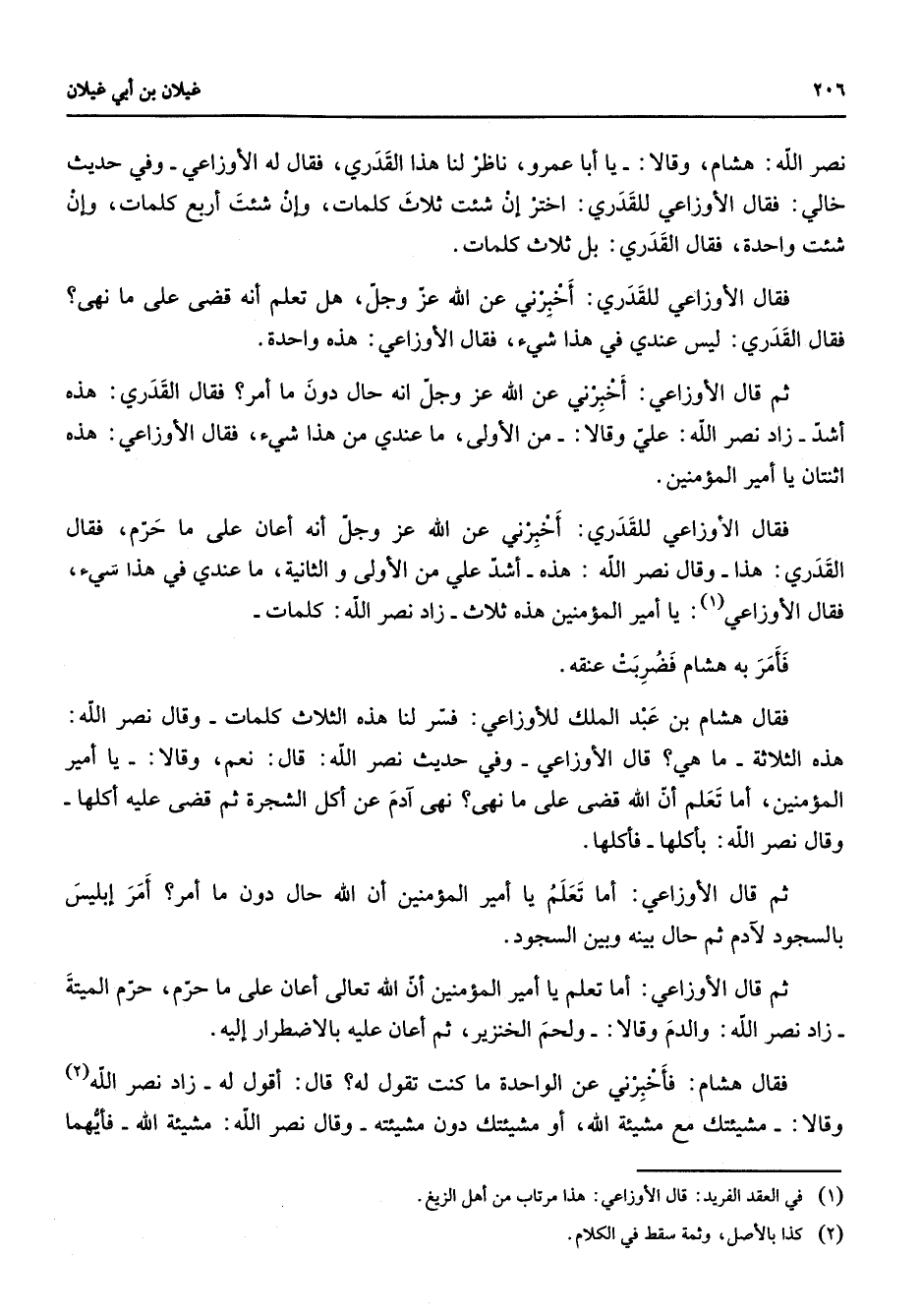 نصرالله هشام وقالا يا أبا عمرو ناظر لنا هذا القدري فقال له الأوزاعي وفي حديث خالي فقال الأوزاعي للقدري للقدري اختر إن شئت ثلاث كلمات وإن شئت أربع كلمات وإن شئت واحدة فقال القدري بل ثلاث كلمات فقال الأوزاعي للقدري أخبرني عن الله عز وجل هل تعلم أنه قضى على ما نهى فقال القدري ليس عندي في هذا شئ فقال الأوزاعي هذه واحدة ثم قال الأوزاعي أخبرني عن الله عز وجل أنه حال دون ما أمر فقال القدري هذه أشد زاد نصرالله علي وقالا من الأولى ما عندي من هذا شئ فقال الأوزاعي هذه اثنتان يا أمير المؤمنين فقال الأوزاعي للقدري أخبرني عن الله عز وجل أنه أعان على ما حرم فقال القدري هذا وقال نصرالله هذه أشد علي من الأولى والثانية ما عندي في هذا شئ فقال الأوزاعي (1) يا أمير المؤمنين هذه ثلاث زاد نصرالله كلمات فأمر به هشام فضربت عنقه فقال هشام بن عبد الملك للأوزاعي فسر لنا هذه الثلاث كلمات وقال نصرالله هذه الثلاثة ما هي قال الأوزاعي وفي حديث نصرالله قال نعم وقالا يا أمير المؤمنين أما تعلم أن الله قضى على ما نهى آدم عن أكل الشجرة ثم قضى عليه أكلها وقال نصر الله بأكلها فأكلها ثم قال الأوزاعي أما تعلم يا أمير المؤمنين أن الله حال دون ما أمر أمر إبليس بالسجود لآدم ثم حال بينه وبين السجود ثم قال الأوزاعي أما تعلم يا أمير المؤمنين أن الله تعالى أعان على ما حرم حرم الميتة زاد نصرالله والدم وقالا ولحم الخنزير ثم أعان عليه بالاضطرار إليه فقال هشام فأخبرني عن الواحدة ما كنت تقول له قال أقول له زاد نصرالله (2) وقالا مشيئتك مع مشيئة الله أو مشيئتك دون مشيئته وقال نصرالله مشيئة الله فأيهما