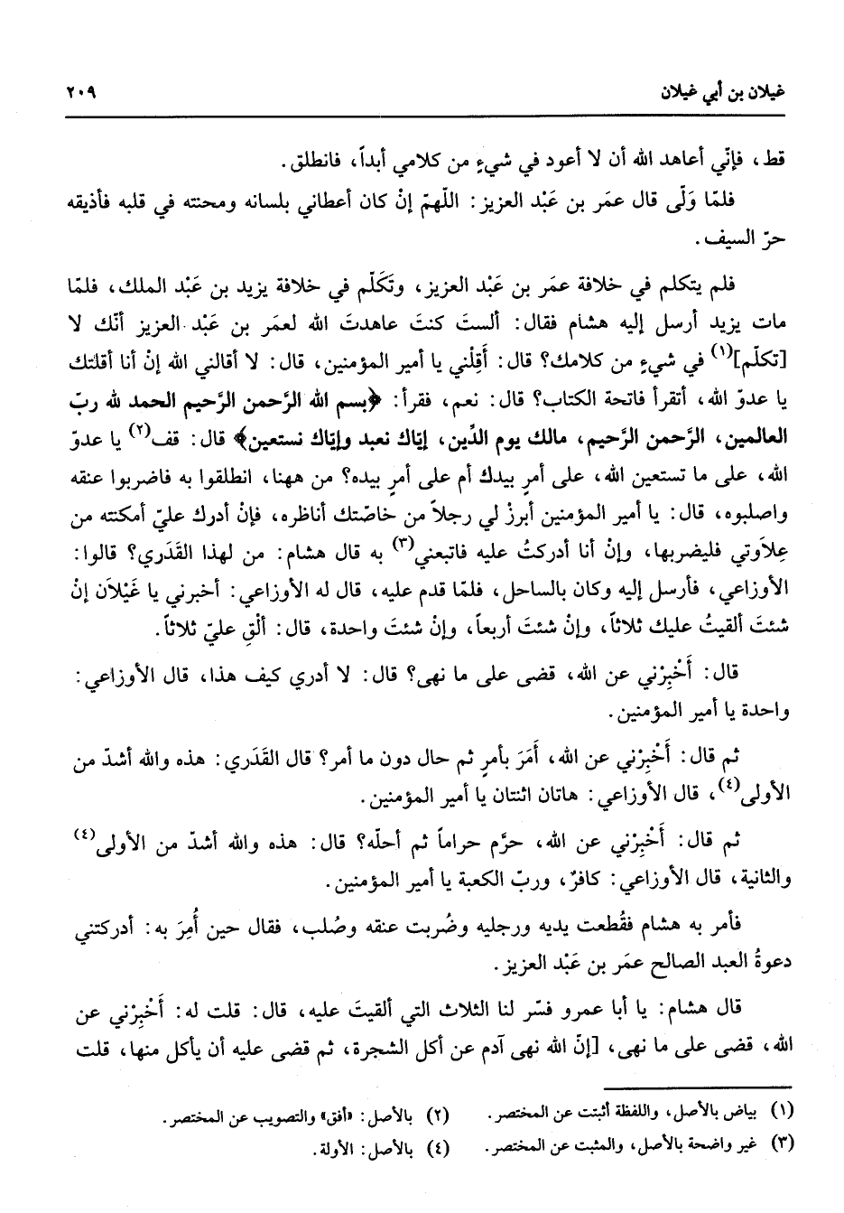" قط فإني أعاهد الله أن لا أعود في شئ من كلامي أبدا فانطلق " فلما ولى قال عمر بن عبد العزيز اللهم إن كان أعطاني بلسانه ومحنته في قلبه فأذيقه حر السيف فلم يتكلم في خلافة عمر بن عبد العزيز وتكلم في خلافة يزيد بن عبد الملك فلما مات يزيد أرسل إليه هشام فقال الست كنت عاهدت الله لعمر بن عبد العزيز أنك لا تكلم في شئ من كلامك قال أقلني يا أمير المؤمنين قال لا أقالني الله إن أنا أقلتك يا عدو الله أتقرأ فاتحة الكتاب قال نعم فقرأ " بسم الله الرحمن الرحيم الحمد لله رب العلمين الرحمن الرحيم مالك يوم الدين إياك نعبد وإياك نستعين " قال قف (2) يا عدو الله على ما تستعين الله على أمر بيدك أم على أمر بيده من ههنا انطلقوا به فاضربوا عنقه واصلبوه قال يا أمير المؤمنين أبرز لي رجلا من خاصتك أناظره فإن أدرك علي أمكنته من علاوتي فليضربها وإن أنا أدركت عليه فاتبعني (3) به قال هشام من لهذا القدري قالوا الأوزاعي فأرسل إليه وكان بالساحل فلما قدم عليه قال له الأوزاعي أخبرني يا غيلان إن شئت ألقيت عليك ثلاثا وإن شئت أربعا وإن شئت واحدة قال ألق علي ثلاثا قال أخبرني عن الله قضى على ما نهى قال لا أدري كيف هذا قال الأوزاعي واحدة يا أمير المؤمنين ثم قال أخبرني عن الله أمر بأمر ثم حال دون ما أمر قال القدري هذه والله أشد من الأولى (4) قال الأوزاعي هاتان اثنتان يا أمير المؤمنين ثم قال أخبرني عن الله حرم حراما ثم أحله قال هذه والله أشد من الأولى (4) والثانية قال الأوزاعي كافر ورب الكعبة يا أمير المؤمنين فأمر به هشام فقطعت يديه ورجليه وضربت عنقه وصلب فقال حين أمر به أدركتني دعوة العبد الصالح عمر بن عبد العزيز قال هشام يا أبا عمرو فسر لنا الثلاث التي ألقيت عليه قال قلت له أخبرني عن الله قضى على ما نهى إن الله نهى آدم عن أكل الشجرة ثم قضى عليه أن يأكل منها قلت