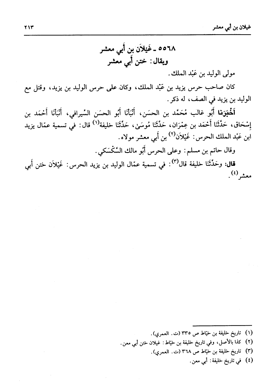 5568 - غيلان بن أبي معشر ويقال ختن أبي معشر مولى الوليد بن عبد الملك كان صاحب حرس يزيد بن عبد الملك وكان على حرس الوليد بن يزيد وقتل مع الوليد بن يزيد في الصف له ذكر أخبرنا أبو غالب محمد بن الحسن أنبأنا أبو الحسن السيرافي أنبأنا أحمد بن إسحاق حدثنا أحمد بن عمران حدثنا موسى حدثنا خليفة قال في تسمية عمال يزيد ابن عبد الملك الحرس غيلان (2) بن أبي معشر مولاه وقال حاتم بن مسلم وعلى الحرس أبو مالك السكسكي قال وحدثنا خليفة قال (3) في تسمية عمال الوليد بن يزيد الحرس غيلان ختن أبي معشر " (4)
