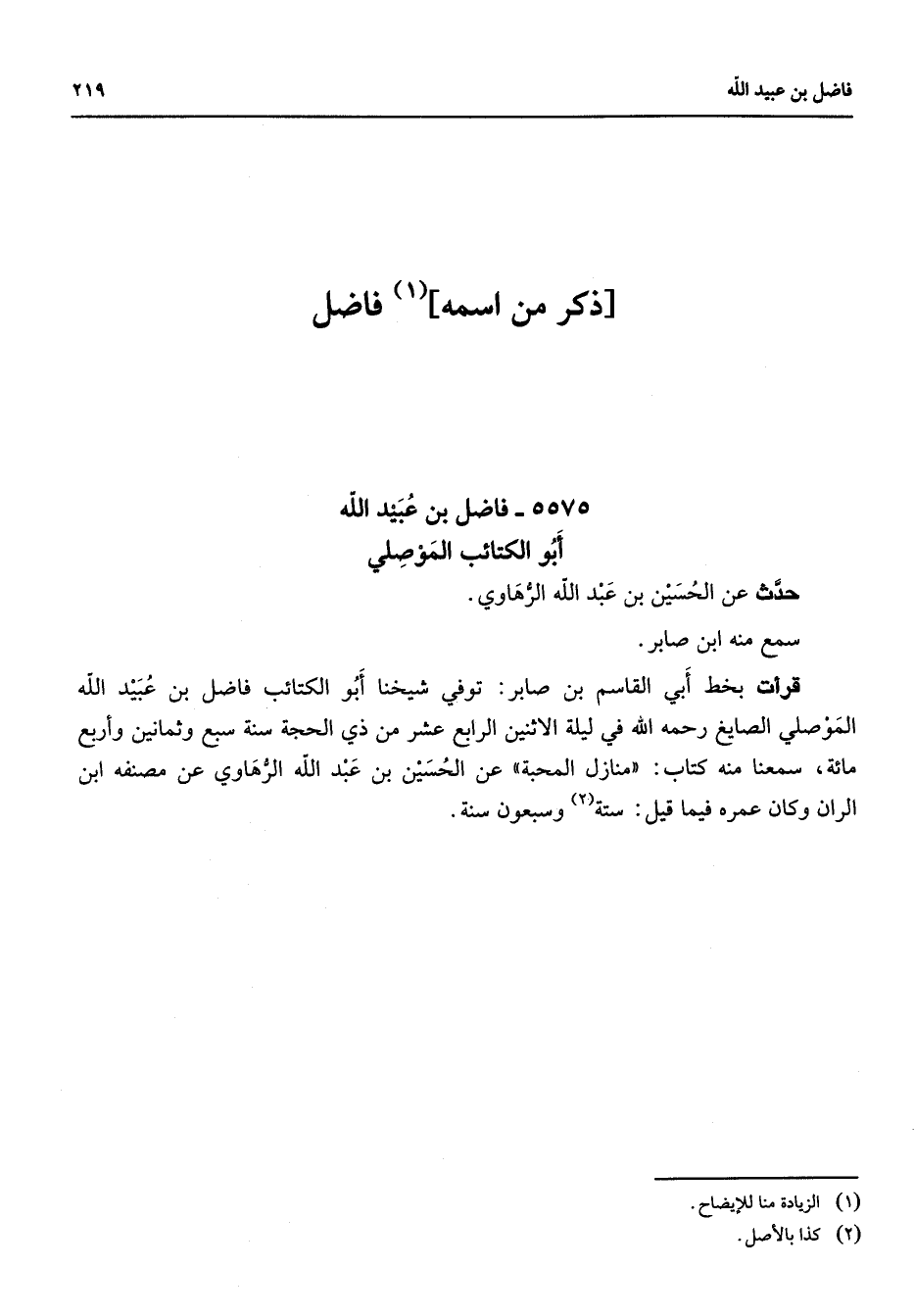 5575 - فاضل بن عبيد الله أبو الكتائب الموصلي حدث عن الحسين بن عبد الله الرهاوي سمع منه ابن صابر قرأت بخط أبي القاسم بن صابر توفي شيخنا أبو الكتائب فاضل بن عبيد الله الموصلي الصايغ رحمه الله في ليلة الأثنين الرابع عشر من ذي الحجة سنة سبع وثمانين وأربع مائة سمعنا منه كتاب منازل المحبة عن الحسين بن عبد الله الرهاوي عن مصنفه ابن الران وكان عمره فيما قيل ستة (2) وسبعون سنة "