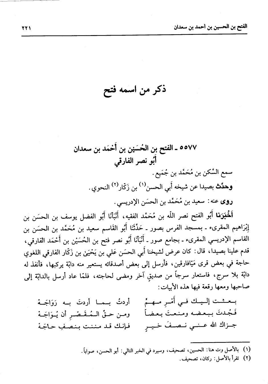 5577 - الفتح بن الحسين بن أحمد بن سعدان أبو نصر الفارقي سمع السكن بن محمد بن جميع وحدث بصيدا عن شيخه أبي الحسن (1) بن زكار (2) النحوي روى عنه سعيد بن محمد بن الحسن الإدريسي أخبرنا أبو الفتح نصرالله بن محمد الفقيه أنبأنا أبو الفضل يوسف بن الحسن بن إبراهيم المقرئ بمسجد الفرس بصور حدثنا أبو القاسم سعيد بن محمد بن الحسن بن القاسم الإدريسي المقرئ بجامع صور أنبأنا أبو نصر فتح بن الحسين بن أحمد الفارقي قدم علينا بصيدا قال كان عرض لشيخنا أبي الحسن علي بن يحيى بن زكار الفارقي اللغوي حاجة في بعض قرى ميافارقين فأرسل إلى بعض أصدقائه يستعير منه دابة يركبها فأنفذ له دابة بلا سرج فاستعار سرجا من صديق آخر ومضى لحاجته فلما عاد أرسل بالدابة إلى صاحبها ومعها رقعة فيها هذه الأبيات بعثت إليك في أمر مهم * أردت بما أردت به رواجه فجدت ببعضه ومنعت بعضا * ومن حق المقصر أن يواجه جزاك الله عني نصف خير * فإنك قد مننت بنصف حاجه