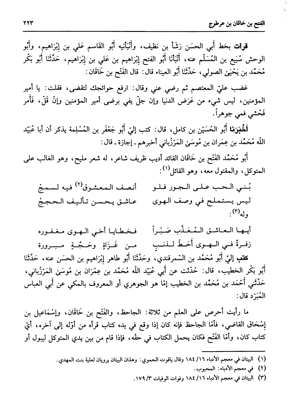 قرأت بخط أبي الحسن رشأ بن نظيف وأنبأنيه أبو القاسم علي بن إبراهيم وأبو الوحش سبيع بن المسلم عنه أنبأنا أبو الفتح إبراهيم بن علي بن إبراهيم حدثنا أبو بكر محمد بن يحيى الصولي حدثنا أبو العيناء قال قال الفتح بن خاقان غضب علي المعتصم ثم رضي عني وقال ارفع حوائجك لتقضى فقلت يا أمير المؤمنين ليس شئ من عرض الدنيا وإن جل يفي برضا أمير المؤمنين وإن قل فأمر فحشي فمي جوهرا أخبرنا أبو الحسين بن كامل قال كتب إلي أبو جعفر بن المسلمة يذكر أن أبا عبيد الله محمد بن عمران بن موسى المرزباني أخبرهم إجازة قال أبو محمد الفتح بن خاقان القائد أديب ظريف شاعر له شعر مليح وهو الغالب على المتوكل والمقتول معه وهو القائل (1) * بني الحب على الجور فلو * أنصف المعشوق (2) فيه لسمج ليس يستملح في وصف الهوى * عاشق يحسن تأليف الحجج * وله (3) * أيها العاشق المعذب صبرا * فخطايا أخي الهوى مغفوره زفرة في الهوى أحط لذنب * من غزاة وحجة مبرورة * كتب إلي أبو محمد بن السمرقندي وحدثنا أبو طاهر إبراهيم بن الحسن عنه حدثنا أبو بكر الخطيب قال حدثت عن أبي عبيد الله محمد بن عمران بن موسى المرزباني حدثني أحمد بن محمد بن الخطيب إما هو الجوهري أو المعروف بالمكي عن أبي العباس المبرد قال ما رأيت أحرص على العلم من ثلاثة الجاحظ والفتح بن خاقان وإسماعيل بن إسحاق القاضي فأما الجاحظ فإنه كان إذا وقع في يده كتاب قرأه من أوله إلى آخره أي كتاب كان وأما الفتح فكان يحمل الكتاب في حقه فإذا قام من بين يدي المتوكل ليبول أو