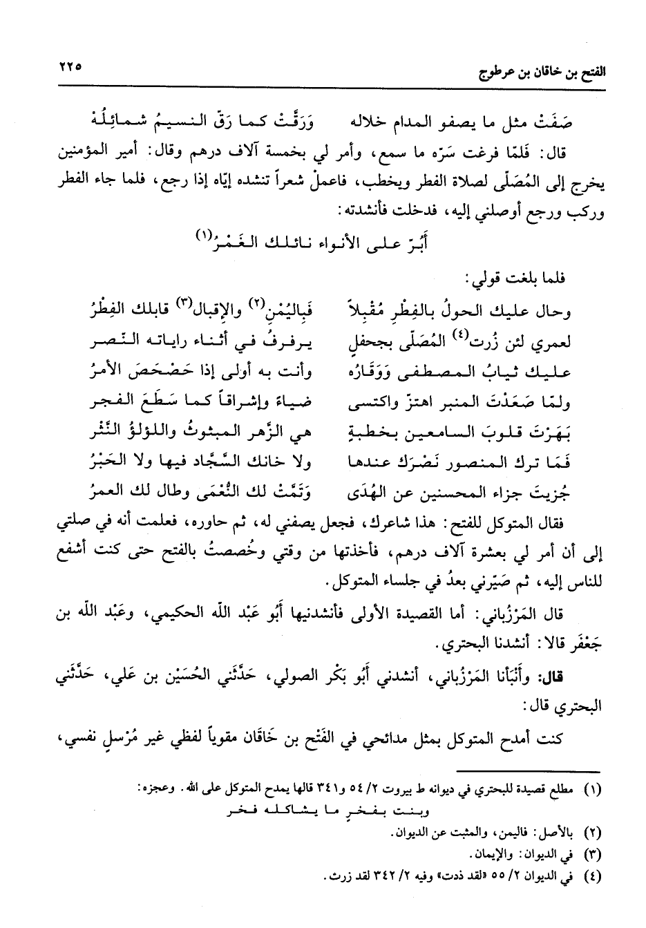 صفت مثل ما يصفو المدام خلاله * ورقت كما رق النسيم شمائله * قال فلما فرغت سره ما سمع وأمر لي بخمسة آلاف درهم وقال أمير المؤمنين يخرج إلى المصلى لصلاة الفطر ويخطب فاعمل شعرا تنشده إياه إذا رجع فلما جاء الفطر وركب ورجع أوصلني إليه فدخلت فأنشدته أبر على الأنواء نائلك الغمر (1) فلما بلغت قولي وحال عليك الحول بالفطر مقبلا * فباليمن (2) والإقبال (3) قابلك الفطر لعمري لئن زرت (4) المصلى بجحفل * يرفرف في أثناء راياته النصر عليك ثياب المصطفى ووقاره * وأنت به أولى إذا حصحص الأمر ولما صعدت المنبر اهتز واكتسى * ضياء وإشراقا كما سطع الفجر بهرت قلوب السامعين بخطبة * هي الزهر المبثوث واللؤلؤ النثر فما ترك المنصور نصرك عندها * ولا خانك السجاد فيها ولا الحبر جزيت جزاء المحسنين عن الهدى * وتمت لك النعمى وطال لك العمر * فقال المتوكل للفتح هذا شاعرك فجعل يصفني له ثم حاوره فعلمت أنه في صلتي إلى أن أمر لي بعشرة آلاف درهم فأخذتها من وقتي وخصصت بالفتح حتى كنت أشفع للناس إليه ثم صيرني بعد في جلساء المتوكل قال المرزباني أما القصيدة الأولى فأنشدنيها أبو عبد الله الحكيمي وعبد الله بن جعفر قالا أنشدنا البحتري قال وأنبأنا المرزباني أنشدني أبو بكر الصولي حدثني الحسين بن علي حدثني البحتري قال كنت أمدح المتوكل بمثل مدائحي في الفتح بن خاقان مقويا لفظي غير مرسل نفسي