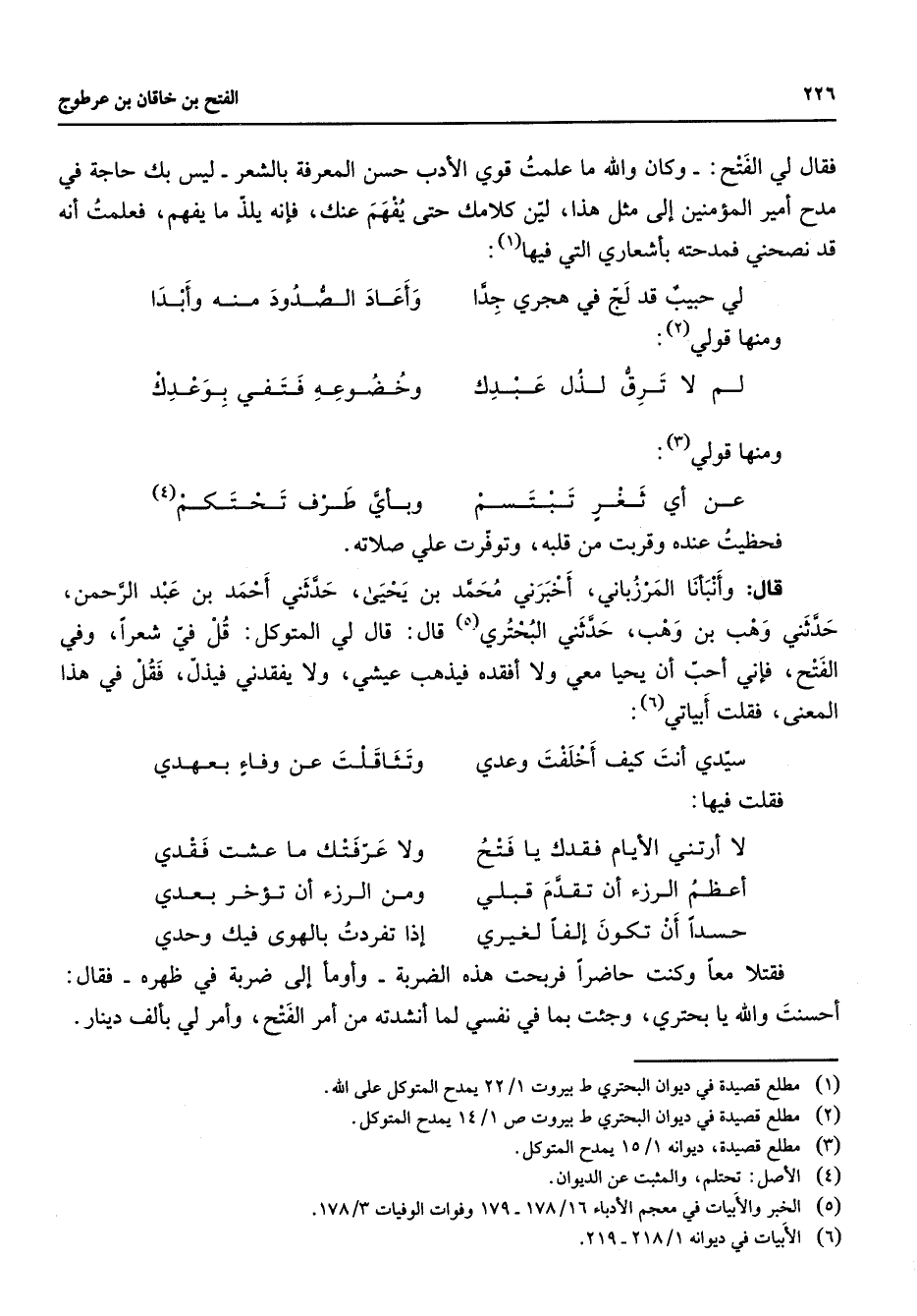 فقال لي الفتح وكان والله ما علمت قوي الأدب حسن المعرفة بالشعر ليس بك حاجة في مدح أمير المؤمنين إلى مثل هذا لين كلامك حتى يفهم عنك فإنه يلذ ما يفهم فعلمت أنه قد نصحني فمدحته بأشعاري التي فيها (1) * لي حبيب قد لج في هجري جدا * وأعاد الصدود منه وأبدا * ومنها قولي (2) * لم لا ترق لذل عبدك * وخضوعه فتفي بوعدك * ومنها قولي (3) * عن أي ثغر تبتسم * وبأي طرف تحتكم * (4) فحظيت عنده وقربت من قلبه وتوفرت علي صلاته قال وأنبأنا المرزباني أخبرني محمد بن يحيى حدثني أحمد بن عبد الرحمن حدثني وهب بن وهب حدثني البحتري (5) قال قال لي المتوكل قل في شعرا وفي الفتح فإني أحب أن يحيا معي ولا أفقده فيذهب عيشي ولا يفقدني فيذل فقل في هذا المعنى فقلت أبياتي (6) سيدي أنت كيف أخلفت وعدي * وتثاقلت عن وفاء بعهدي * فقلت فيها لا أرتني الأيام فقدك يا فتح * ولا عرفتك ما عشت فقدي أعظم الرزء أن تقدم قبلي * ومن الرزء أن تؤخر بعدي حسدا أن تكون إلفا لغيري * إذا تفردت بالهوى فيك وحدي * فقتلا معا وكنت حاضرا فربحت هذه الضربة وأومأ إلى ضربة في ظهره فقال أحسنت والله يا بحتري وجئت بما في نفسي لما أنشدته من أمر الفتح وأمر لي بألف دينار