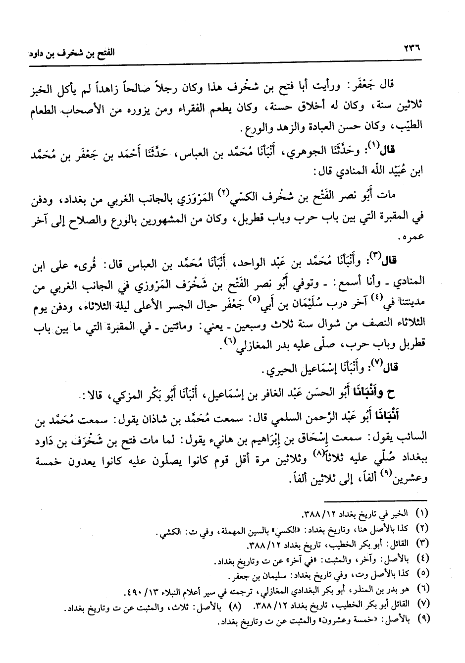قال جعفر ورأيت أبا فتح بن شخرف هذا وكان رجلا صالحا زاهدا لم يأكل الخبز ثلاثين سنة وكان له أخلاق حسنة وكان يطعم الفقراء ومن يزوره من الأصحاب الطعام الطيب وكان حسن العبادة والزهد والورع قال (1) وحدثنا الجوهري أنبأنا محمد بن العباس حدثنا أحمد بن جعفر بن محمد ابن عبيد الله المنادي قال مات أبو نصر الفتح بن شخرف الكسي (2) المروزي بالجانب الغربي من بغداد ودفن في المقبرة التي بين باب حرب وباب قطربل وكان من المشهورين بالورع والصلاح إلى آخر عمره قال (3) وأنبأنا محمد بن عبد الواحد أنبأنا محمد بن العباس قال قرئ على ابن المنادي وأنا أسمع وتوفي أبو نصر الفتح بن شخرف المروزي في الجانب الغربي من مدينتنا في (4) آخر درب سليمان بن أبي (5) جعفر حيال الجسر الأعلى ليلة الثلاثاء ودفن يوم الثلاثاء النصف من شوال سنة ثلاث وسبعين يعني ومائتين في المقبرة التي ما بين باب قطربل وباب حرب صلى عليه بدر المغازلي (6) قال (7) وأنبأنا إسماعيل الحيري ح وأنبأنا أبو الحسن عبد الغافر بن إسماعيل أنبأنا أبو بكر المزكي قالا أنبأنا أبو عبد الرحمن السلمي قال سمعت محمد بن شاذان يقول سمعت محمد بن السائب يقول سمعت إسحاق بن إبراهيم بن هانئ يقول لما مات فتح بن شخرف بن داود ببغداد صلي عليه ثلاثا وثلاثين مرة أقل قوم كانوا يصلون عليه كانوا يعدون خمسة وعشرين (9) ألفا إلى ثلاثين ألفا