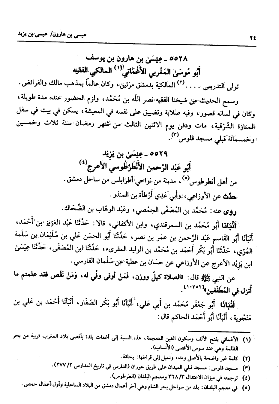 5528 - عيسى بن هارون بن يوسف أبو موسى المغربي الأغماتي (1) المالكي الفقيه تولى التدريس (2) المالكية بدمشق مرتين وكان عالما بمذهب مالك والفرائض وسمع الحديث من شيخنا الفقيه نصرالله بن محمد ولزم الحضور عنده مدة طويلة وكان في لسانه قصور وفيه صلابة وتضييق على نفسه في المعيشة يسكن في بيت في سفل المنارة الشرقية مات ودفن يوم الاثنين الثالث من شهر رمضان سنة ثلاث وخمسين وخمسمائة قبلي مسجد فلوس (3)