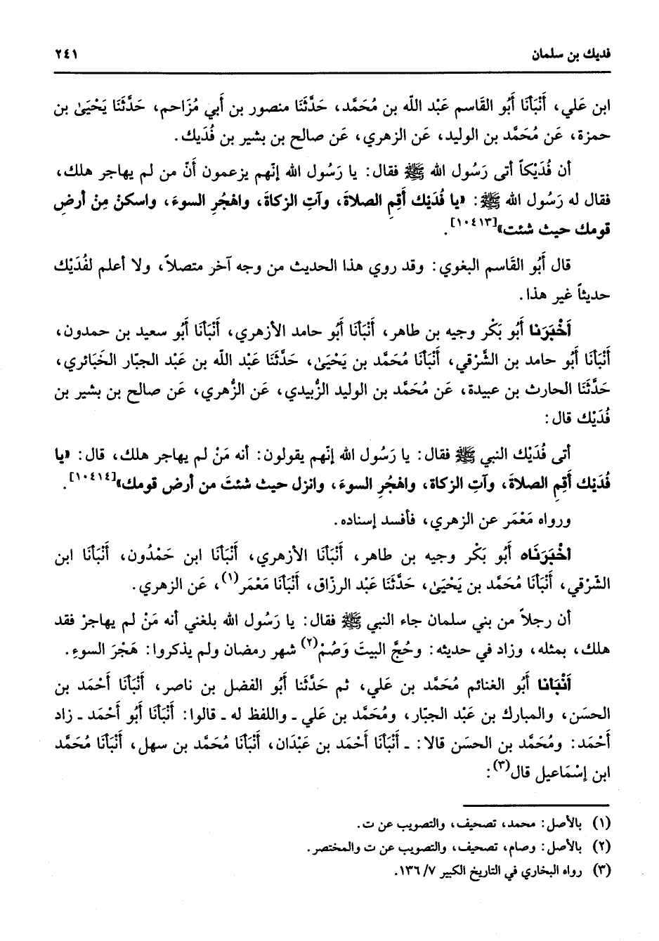ابن علي أنبأنا أبو القاسم عبد الله بن محمد حدثنا منصور بن أبي مزاحم حدثنا يحيى بن حمزة عن محمد بن الوليد عن الزهري عن صالح بن بشير بن فديك أن فديكا أتى رسول الله (صلى الله عليه وسلم) فقال يا رسول الله إنهم يزعمون أن من لم يهاجر هلك فقال له رسول الله (صلى الله عليه وسلم) يا فديك أقم الصلاة وآت الزكاة واهجر السوء واسكن من أرض قومك حيث شئت قال أبو القاسم البغوي وقد روي هذا الحديث من وجه آخر متصلا ولا أعلم لفديك حديثا غير هذا أخبرنا أبو بكر وجيه بن طاهر أنبأنا أبو حامد الأزهري أنبأنا أبو سعيد بن حمدون أنبأنا أبو حامد بن الشرقي أنبأنا محمد بن يحيى حدثنا عبد الله بن عبد الجبار الخبائري حدثنا الحارث بن عبيدة عن محمد بن الوليد الزبيدي عن الزهري عن صالح بن بشير بن فديك قال أتى فديك إلى النبي (صلى الله عليه وسلم) فقال يا رسول الله إنهم يقولون أنه من لم يهاجر هلك قال يا فديك أقم الصلاة وآت الزكاة واهجر السوء وانزل حيث شئت من أرض قومك ورواه معمر عن الزهري فأفسد إسناده أخبرناه أبو بكر وجيه بن طاهر أنبأنا الأزهري أنبأنا ابن حمدون أنبأنا ابن الشرقي أنبأنا محمد بن يحيى حدثنا عبد الرزاق أنبأنا معمر (1) عن الزهري أن رجلا من بني سلمان جاء النبي (صلى الله عليه وسلم) فقال يا رسول الله بلغني أنه من لم يهاجر فقد هلك بمثله وزاد في حديثه وحج البيت وصم (2) شهر رمضان ولم يذكروا هجر السوء أنبأنا أبو الغنائم محمد بن علي ثم واللفظ له قالوا أنبأنا أبو أحمد زاد أحمد ومحمد بن الحسن قالا أنبانا أحمد بن عبدان أنبأنا محمد بن سهل أنبأنا محمد بن إسماعيل قال (3)