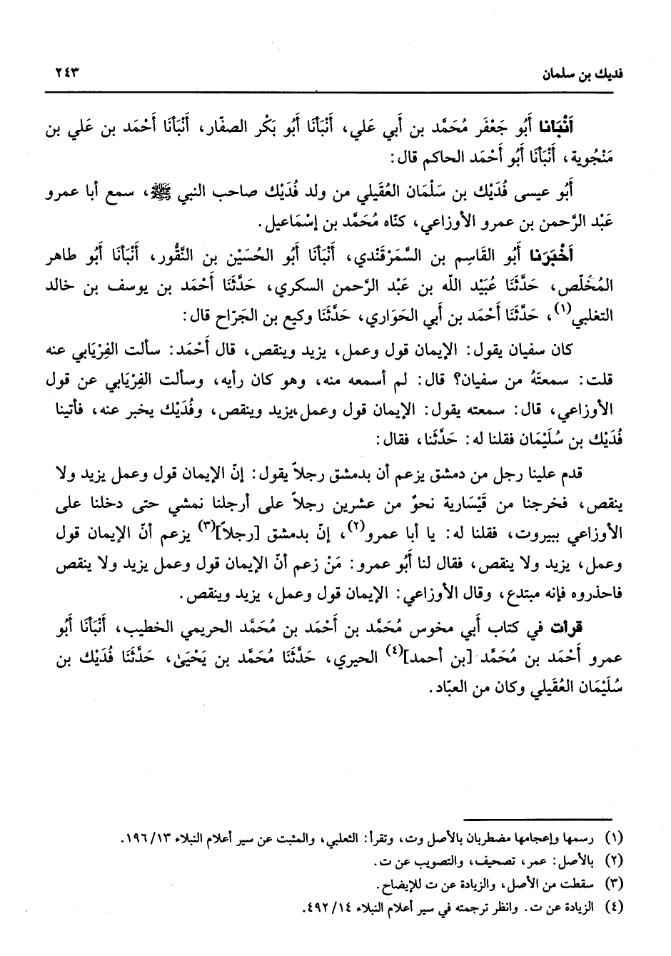 أنبأنا أبو جعفر محمد بن أبي علي أنبأنا أبو بكر الصفار أنبأنا أحمد بن علي بن منجوية أنبأنا أبو أحمد الحاكم قال أبو عيسى فديك بن سلمان العقيلي من ولد فديك صاحب النبي (صلى الله عليه وسلم) سمع أبا عمرو عبد الرحمن بن عمرو الأوزاعي كناه محمد بن إسماعيل أخبرنا أبو القاسم بن السمرقندي أنبأنا أبو الحسين بن النقور أنبأنا أبو طاهر المخلص حدثنا عبيد الله بن عبد الرحمن السكري حدثنا أحمد بن يوسف بن خالد التغلبي (1) حدثنا أحمد بن أبي الحواري حدثنا وكيع بن الجراح قال كان سفيان يقول الإيمان قول وعمل يزيد وينقص قال أحمد سألت الفريابي عنه قلت سمعته من سفيان قال لم أسمعه منه وهو كان رأيه وسألت الفريابي عن قول الأوزاعي قال سمعته يقول الإيمان قول وعمل يزيد وينقص وفديك يخبر عنه فأتينا فديك بن سليمان فقلنا له حدثنا فقال قدم علينا رجل من دمشق يزعم أن بدمشق رجلا يقول أن الإيمان قول وعمل يزيد ولا ينقص فخرجنا من قيسارية نحو من عشرين رجلا على أرجلنا نمشي حتى دخلنا على الأوزاعي ببيروت فقلنا له يا أبا عمرو (2) إن بدمشق رجلا (3) يزعم أن الإيمان قول وعمل يزيد ولا ينقص فقال لنا أبو عمرو من زعم أن الإيمان قول وعمل يزيد ولا ينقص فاحذروه فإنه مبتدع وقال الأوزاعي الإيمان قول وعمل يزيد وينقص قرأت في كتاب أبي مخوس محمد بن أحمد بن محمد الحريمي الخطيب أنبأنا أبو عمرو أحمد بن محمد بن أحمد (4) الحيري حدثنا محمد بن يحيى حدثنا فديك بن سليمان العقيلي وكان من العباد