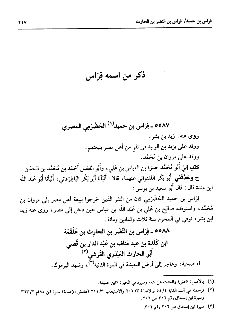 5587 - فراس بن حميد (1) الحضرمي المصري روى عنه زيد بن بشر ووفد على يزيد بن الوليد في نفر من أهل مصر ببيعتهم ووفد على مروان بن محمد كتب إلي أبو محمد حمزة بن العباس بن علي وأبو الفضل أحمد بن محمد بن الحسن ح وحدثني أبو بكر اللفتواني عنهما قالا أنبأنا أبو بكر الباطرقاني أنبأنا أبو عبد الله ابن مندة قال قال أبو سعيد بن يونس فراس بن حميد الحضرمي كان من النفر الذين خرجوا ببيعة أهل مصر إلى مروان بن محمد واستوفده صالح بن علي بن عبد الله بن عباس حين دخل إلى مصر روى عنه زيد ابن بشر توفي في المحرم سنة ثلاث وثمانين ومائة