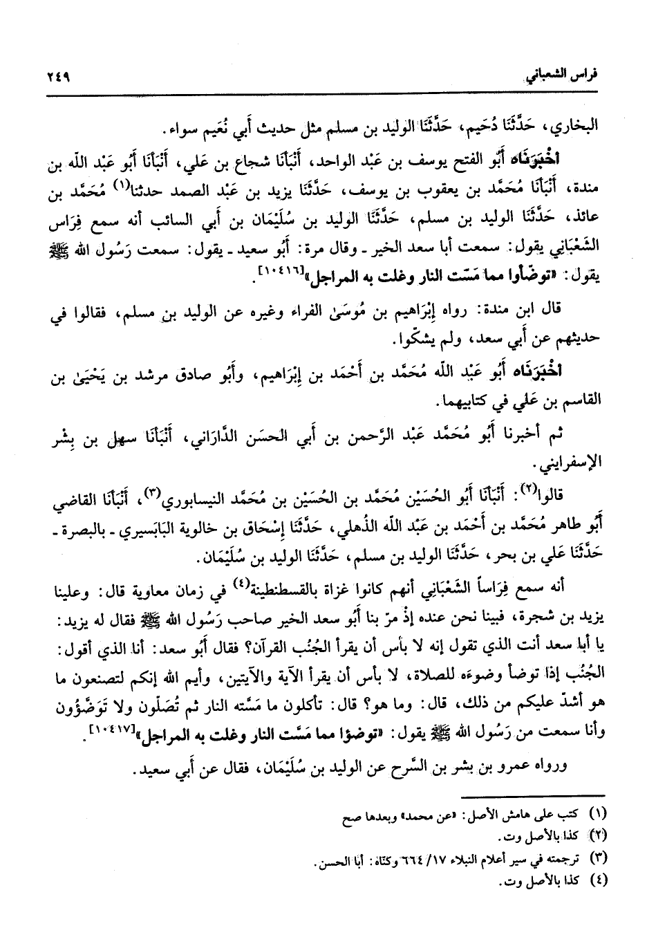 البخاري حدثنا دحيم حدثنا الوليد بن مسلم مثل حديث أبي نعيم سواء أخبرناه أبو الفتح يوسف بن عبد الواحد أنبأنا شجاع بن علي أنبأنا أبو عبد الله بن مندة أنبأنا محمد بن يعقوب بن يوسف حدثنا يزيد بن عبد الصمد حدثنا (1) محمد بن عائذ حدثنا الوليد بن مسلم حدثنا الوليد بن سليمان بن أبي السائب أنه سمع فراس الشعباني يقول سمعت أبا سعد الخير وقال مرة أبو سعيد يقول سمعت رسول الله (صلى الله عليه وسلم) يقول توضأوا مما مست النار وغلت به المراجل قال ابن مندة رواه إبراهيم بن موسى الفراء وغيره عن الوليد بن مسلم فقالوا في حديثهم عن أبي سعد ولم يشكوا أخبرناه أبو عبد الله محمد بن أحمد بن إبراهيم وأبو صادق مرشد بن يحيى بن القاسم بن علي في كتابيهما ثم أخبرنا أبو محمد عبد الرحمن بن أبي الحسن الداراني أنبأنا سهل بن بشر الإسفرايني قالوا (2) أنبأنا أبو الحسين محمد بن الحسين بن محمد النيسابوري (3) أنبأنا القاضي أبو طاهر محمد بن أحمد بن عبد الله الذهلي حدثنا إسحاق بن خالويه البابسيري بالبصرة حدثنا علي بن بحر حدثنا الوليد بن مسلم حدثنا الوليد بن سليمان أنه سمع فراسا الشعباني أنهم كانوا غزاة بالقسطنطنية (4) في زمان معاوية قال وعلينا يزيد بن شجرة فبينا نحن عنده إذ مر بنا أبو سعد الخير صاحب رسول الله (صلى الله عليه وسلم) فقال له يزيد يا أبا سعد أنت الذي تقول إنه لا بأس أن يقرأ الجنب القرآن فقال أبو سعد أنا الذي أقول الجنب إذا توضأ وضوءه للصلاة لا بأس أن يقرأ الآية والآيتين وأيم الله إنكم لتصنعون ما هو أشد عليكم من ذلك قال وما هو قال تأكلون ما مسته النار ثم تصلون ولا توضؤون وأنا سمعت من رسول الله (صلى الله عليه وسلم) يقول توضؤا مما مست النار وغلت به المراجل ورواه عمرو بن بشر بن السرح عن الوليد بن سليمان فقال عن أبي سعيد