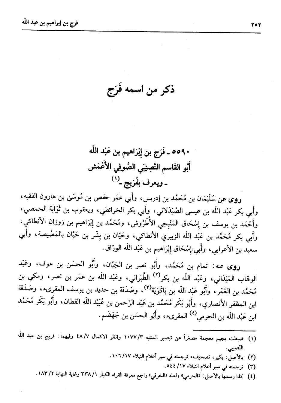 5590 - فرج بن إبراهيم بن عبد الله أبو القاسم النصيبي الصوفي الأعمش ويعرف بفريج (1) روى عن سليمان بن محمد بن إدريس وأبي عمر حفص بن موسى بن هارون الفقيه وأبي بكر عبد الله بن عيسى الصيدلاني وأبي بكر الخرائطي ويعقوب بن ثوابة الحمصي وأحمد بن يوسف بن إسحاق المنبجي الأطروش ومحمد بن إبراهيم بن زوزان الأنطاكي وأبي بكر محمد بن عبد الله الزبيري الأنطاكي وحيان بن بشر بن حيان بالمصيصة وأبي سعيد بن الأعرابي وأبي إسحاق إبراهيم بن عبد الله الوراق روى عنه تمام بن محمد وأبو نصر بن الجبان وأبو الحسن بن عوف وعبد الوهاب الميداني وعبد الله بن بكر (2) الطبراني وعبد الله بن عمر بن نصر ومكي بن محمد بن الغمر وأبو عبد الله بن باكوية (3) وصدقة بن حديد بن يوسف المقرئ وصدقة ابن المظفر الأنصاري وأبو بكر محمد بن عبد الرحمن بن عبيد الله القطان وأبو بكر محمد ابن عبد الله بن الحرمي (4) المقرئ وأبو الحسن بن جهضم