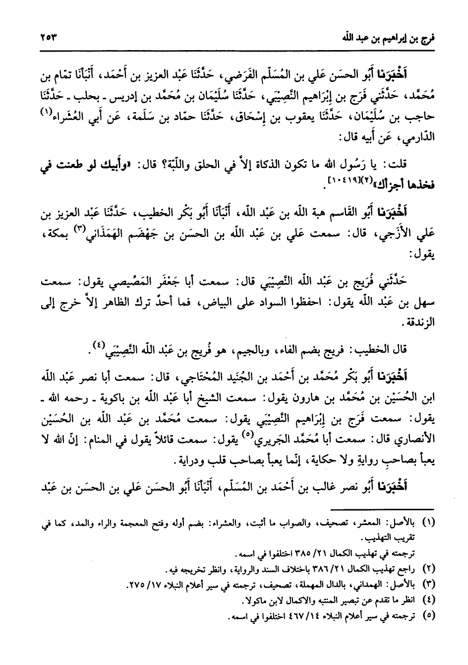 أخبرنا أبو الحسن علي بن المسلم الفرضي حدثنا عبد العزيز بن أحمد أنبأنا تمام بن محمد حدثني فرج بن إبراهيم النصيبي حدثنا سليمان بن محمد بن إدريس بحلب حدثنا حاجب بن سليمان حدثنا يعقوب بن إسحاق حدثنا حماد بن سلمة عن أبي العشراء (1) الدارمي عن أبيه قال قلت يا رسول الله ما تكون الذكاة إلا في الحلق واللبة قال وأبيك لو طعنت في فخذها أجزأك (2) أخبرنا أبو القاسم هبة الله بن عبد الله أنبأنا أبو بكر الخطيب حدثنا عبد العزيز بن علي الأزجي قال سمعت علي بن عبد الله بن الحسن بن جهضم الهمذاني (3) بمكة يقول حدثني فريج بن عبد الله النصيبي قال سمعت أبا جعفر المصيصي يقول سمعت سهل بن عبد الله يقول احفظوا السواد على البياض فما أحد ترك الظاهر إلا خرج إلى الزندقة قال الخطيب فريج بضم الفاء وبالجيم هو فريج بن عبد الله النصيبي (4) أخبرنا أبو بكر محمد بن أحمد بن الجنيد المحتاجي قال سمعت أبا نصر عبد الله ابن الحسين بن محمد بن هارون يقول سمعت الشيخ أبا عبد الله بن باكوية رحمه الله يقول سمعت فرج بن إبراهيم النصيبي يقول سمعت محمد بن عبد الله بن الحسين الانصاري قال سمعت أبا محمد الجريري (5) يقول سمعت قائلا يقول في المنام إن الله لا يعبأ بصاحب رواية ولا حكاية إنما يعبأ بصاحب قلب ودراية أخبرنا أبو غالب بن إحمد بن المسلم أنبأنا أبو الحسن علي بن الحسن بن عبد