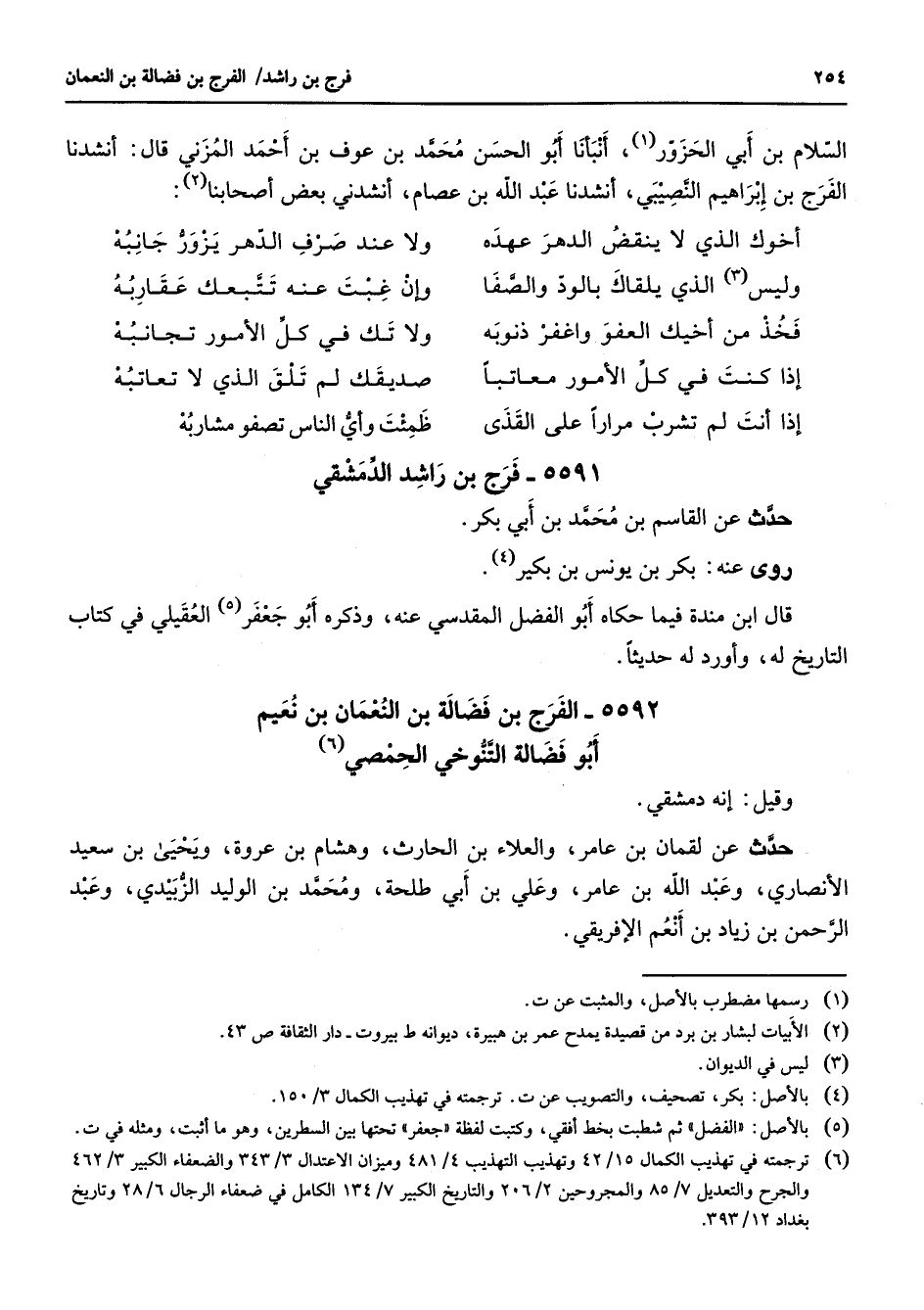 5592 - الفرج بن فضالة بن النعمان بن نعيم أبو فضالة التنوخي الحمصي (6) وقيل إنه دمشقي حدث عن لقمان بن عامر والعلاء بن الحارث وهشام بن عروة ويحيى بن سعيد الأنصاري وعبد الله بن عامر وعلي بن أبي طلحة ومحمد بن الوليد الزبيدي وعبد الرحمن بن زياد بن أنعم الإفريقي