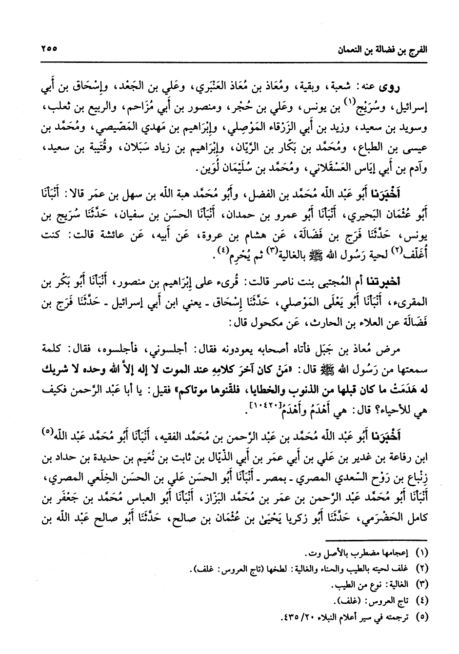 روى عنه شعبة وبقية ومعاذ بن معاذ العنبري وعلي بن الجعد وإسحاق بن أبي إسرائيل وسريج (1) بن يونس وعلي بن حجر ومنصور بن أبي مزاحم والربيع بن ثعلب وسويد بن سعيد وزيد بن أبي الزرقاء الموصلي وإبراهيم بن مهدي المصيصي ومحمد بن عيسى بن الطباع ومحمد بن بكار بن الريان وإبراهيم بن زياد سبلان وقتيبة بن سعيد وآدم بن أبي إياس العسقلاني ومحمد بن سليمان لوين أخبرنا أبو عبد الله محمد بن الفضل وأبو محمد هبة الله بن سهل بن عمر قالا أنبأنا أبو عثمان البحيري أنبأنا أبو عمرو بن حمدان أنبأنا الحسن بن سفيان حدثنا سريج بن يونس حدثنا فرج بن فضالة عن هشام بن عروة عن أبيه عن عائشة قالت كنت أغلف (2) لحية رسول الله (صلى الله عليه وسلم) بالغالية (3) ثم يحرم (4) أخبرتنا أم المجتبى بنت ناصر قالت قرئ على إبراهيم بن منصور أنبأنا أبو بكر بن المقرئ أنبأنا أبو يعلى الموصلي حدثنا إسحاق يعني ابن أبي إسرائيل حدثنا فرج بن فضالة عن العلاء بن الحارث عن مكحول قال مرض معاذ بن جبل فأتاه أصحابه يعودونه فقال أجلسوني فأجلسوه فقال كلمة سمعتها من رسول الله (صلى الله عليه وسلم) قال من كان آخر كلامه عند الموت لاإله إلا الله وحده لا شريك له هدمت ما كان قبلها من الذنوب والخطايا فلقنوها موتاكم فقيل يا أبا عبد الرحمن فكيف هي للأحياء قال هي أهدم وأهدم أخبرنا أبو عبد الله محمد بن عبد الرحمن بن محمد الفقيه أنبأنا أبو محمد عبد الله (5) ابن رفاعة بن غدير بن علي بن أبي عمر بن أبي الذيال بن ثابت بن نعيم بن حديدة بن حداد بن زنباع بن روح السعدي المصري بمصر أنبأنا أبو الحسن علي بن الحسن الخلعي المصري أنبأنا أبو محمد عبد الرحمن بن عمر بن محمد البزاز أنبأنا أبو العباس محمد بن جعفر بن كامل الحضرمي حدثنا أبو زكريا يحيى بن عثمان بن صالح حدثنا أبو صالح عبد الله بن