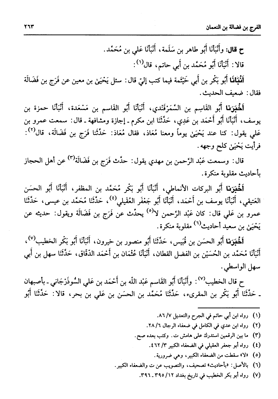 ح قال وأنبأنا أبو طاهر بن سلمة أنبأنا علي بن محمد قالا أنبأنا أبو محمد بن أبي حاتم قال (1) أنبأنا أبو بكر بن أبي خيثمة فيما كتب إلي قال سئل يحيى بن معين عن فرج بن فضالة فقال ضعيف الحديث أخبرنا أبو القاسم بن السمرقندي أنبأنا أبو القاسم بن مسعدة أنبأنا حمزة بن يوسف أنبأنا أبو أحمد بن عدي حدثنا ابن مكرم إجازة ومشافهة قال سمعت عمرو بن علي يقول كنا عند يحيى يوما ومعنا معاذ فقال معاذ حدثنا فرج بن فضالة قال (2) فرأيت يحيى كلح وجهه قال وسمعت عبد الرحمن بن مهدي يقول حدث فرج بن فضالة (3) عن أهل الحجاز بأحاديث مقلوبة منكرة أخبرنا أبو البركات الأنماطي أنبأنا أبو بكر محمد بن المظفر أنبأنا أبو الحسن العتيقي أنبأنا يوسف بن أحمد أنبأنا أبو جعفر العقيلي (4) حدثنا محمد بن عيسى حدثنا عمرو بن علي قال كان عبد الرحمن لا (5) يحدث عن فرج بن فضالة ويقول حديثه عن يحيى بن سعيد أحاديث (6) مقلوبة منكرة أخبرنا أبو الحسن بن قبيس حدثنا أبو منصور بن خيرون أنبأنا أبو بكر الخطيب (7) أنبأنا محمد بن الحسين بن الفضل القطان أنبأنا عثمان بن أحمد الدقاق حدثنا سهل بن أبي سهل الواسطي ح قال الخطيب (7) وأنبأنا أبو القاسم عبد الله بن أحمد بن علي السوذرجاني بأصبهان حدثنا أبو بكر بن المقرئ حدثنا محمد بن الحسن بن علي بن بحر قالا حدثنا أبو