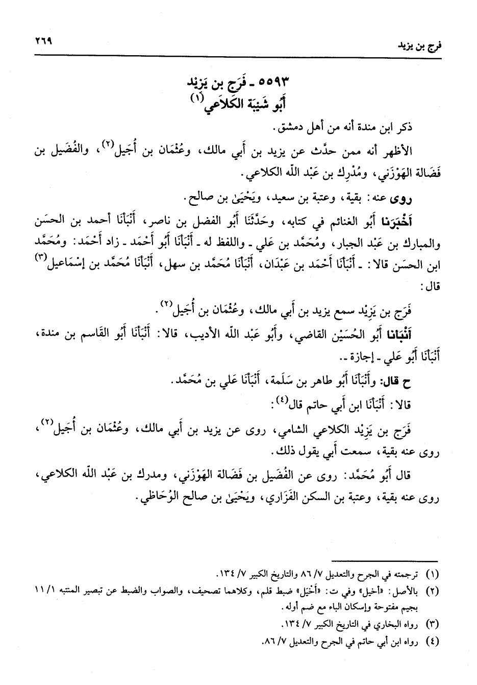 5593 - فرج بن يزيد أبو شيبة الكلاعي (1) ذكر ابن مندة أنه من أهل دمشق الأظهر أنه ممن حدث عن يزيد بن أبي مالك وعثمان بن أجيل (2) والفضيل بن فضالة الهوزني ومدرك بن عبد الله الكلاعي روى عنه بقية وعتبة بن سعيد ويحيى بن صالح أخبرنا أبو الغنائم في كتابه وحدثنا أبو الفضل بن ناصر أنبأنا أحمد بن الحسن والمبارك بن عبد الجبار ومحمد بن علي واللفظ له أنبأنا أبو أحمد زاد أحمد ومحمد ابن الحسن قالا أنبأنا أحمد بن عبدان أنبأنا محمد بن سهل أنبأنا محمد بن إسماعيل (3) قال فرج بن يزيد سمع يزيد بن أبي مالك وعثمان بن أجيل (2) أنبأنا أبو الحسين القاضي وأبو عبد الله الأديب قالا أنبأنا أبو القاسم بن مندة أنبأنا أبو علي إجازة ح قال وأنبأنا أبو طاهر بن سلمة أنبأنا علي بن محمد قالا أنبأنا ابن أبي حاتم قال (4) فرج بن يزيد الكلاعي الشامي روى عن يزيد بن أبي مالك وعثمان بن أجيل (2) روى عنه بقية سمعت أبي يقول ذلك قال أبو محمد روى عن الفضيل بن فضالة الهوزني ومدرك بن عبد الله الكلاعي روى عنه بقية وعتبة بن السكن الفزاري ويحيى بن صالح الوحاظي "