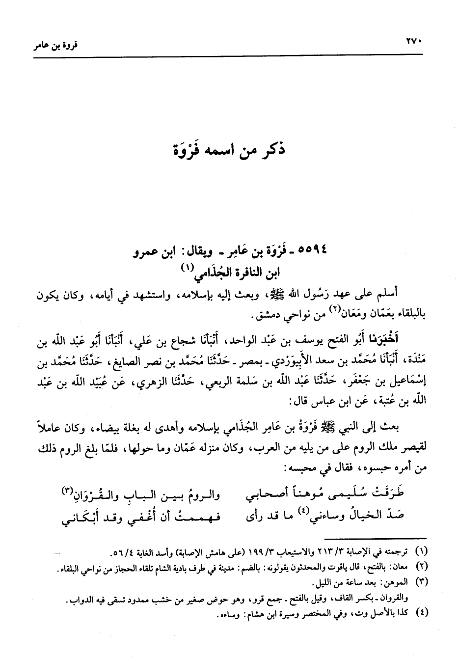 5594 - فروة بن عامر ويقال ابن عمرو ابن النافرة الجذامي (1) أسلم على عهد رسول الله (صلى الله عليه وسلم) وبعث إليه بإسلامه واستشهد في أيامه وكان يكون بالبلقاء بعمان ومعان (2) من نواحي دمشق أخبرنا أبو الفتح يوسف بن عبد الواحد أنبأنا شجاع بن علي أنبأنا أبو عبد الله بن مندة أنبأنا محمد بن سعد الأبيوردي بمصر حدثنا محمد بن نصر الصايغ حدثنا محمد بن إسماعيل بن جعفر حدثنا عبد الله بن سلمة الربعي حدثنا الزهري عن عبيد الله بن عبد الله بن عتبة عن ابن عباس قال بعث إلى النبي (صلى الله عليه وسلم) فروة بن عامر الجذامي بإسلامه واهدى له بغلة بيضاء وكان عاملا لقيصر ملك الروم على من يليه من العرب وكان منزله عمان وما حولها فلما بلغ الروم ذلك من أمره حبسوه فقال في محبسه طرقت سليمى موهنا أصحابي * والروم بين الباب والقروان (3) صد الخيال وساءني (4) ما قد رأى * فهممت أن أغفي وقد أبكاني