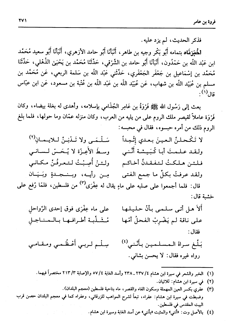 * فذكر الحديث ولم يزد عليه أخبرناه بتمامه أبو بكر وجيه بن طاهر أنبأنا أبو حامد الأزهري أنبأنا أبو سعيد محمد ابن عبد الله بن حمدون أنبأنا أبو حامد بن الشرقي حدثنا محمد بن يحيى الذهلي حدثنا محمد بن إسماعيل بن جعفر الجعفري حدثني عبد الله بن سلمة الربعي عن محمد بن مسلم بن عبيد الله بن شهاب عن عبيد الله بن عبد الله بن عتبة بن مسعود عن ابن عباس قال (1) بعث إلى رسول الله (صلى الله عليه وسلم) فروة بن عامر الجذامي بإسلامه واهدى له بغله بيضاء وكان فروة عاملا لقيصر ملك الروم على من يليه من العرب وكان منزله عمان وما حولها فلما بلغ الروم ذلك من امره حبسوه فقال في محبسه * لاتكحلن العين بعدي إثمدا * سلمى ولا تدنن للايمان (2) * ولقد علمت أبا كبيشة أنني * وسط الأعزة لا يحس لساني فلئن هلكت لتفقدن أخاكم * ولئن أصبت لتعرفن مكاني ولقد عرفت بكل ما جمع الفتى * من رأيه وبنجدة وبيان * قال فلما أجمعوا على صلبه على ماء يقال له عفرى (3) من فلسطين فلما رفع على خشبة قال الأهل أتى سلمى بأن حليلها * على ماء عفرى فوق إحدى الرواحل على ناقة لم يضرب الفحل أمها * مشذبة أطرافها بالمناجل فقال بلغ سراة المسلمين بأنني (4) * سلم لربي أعظمي ومقامي * رواه غيره فقال لا يحسن بشأني