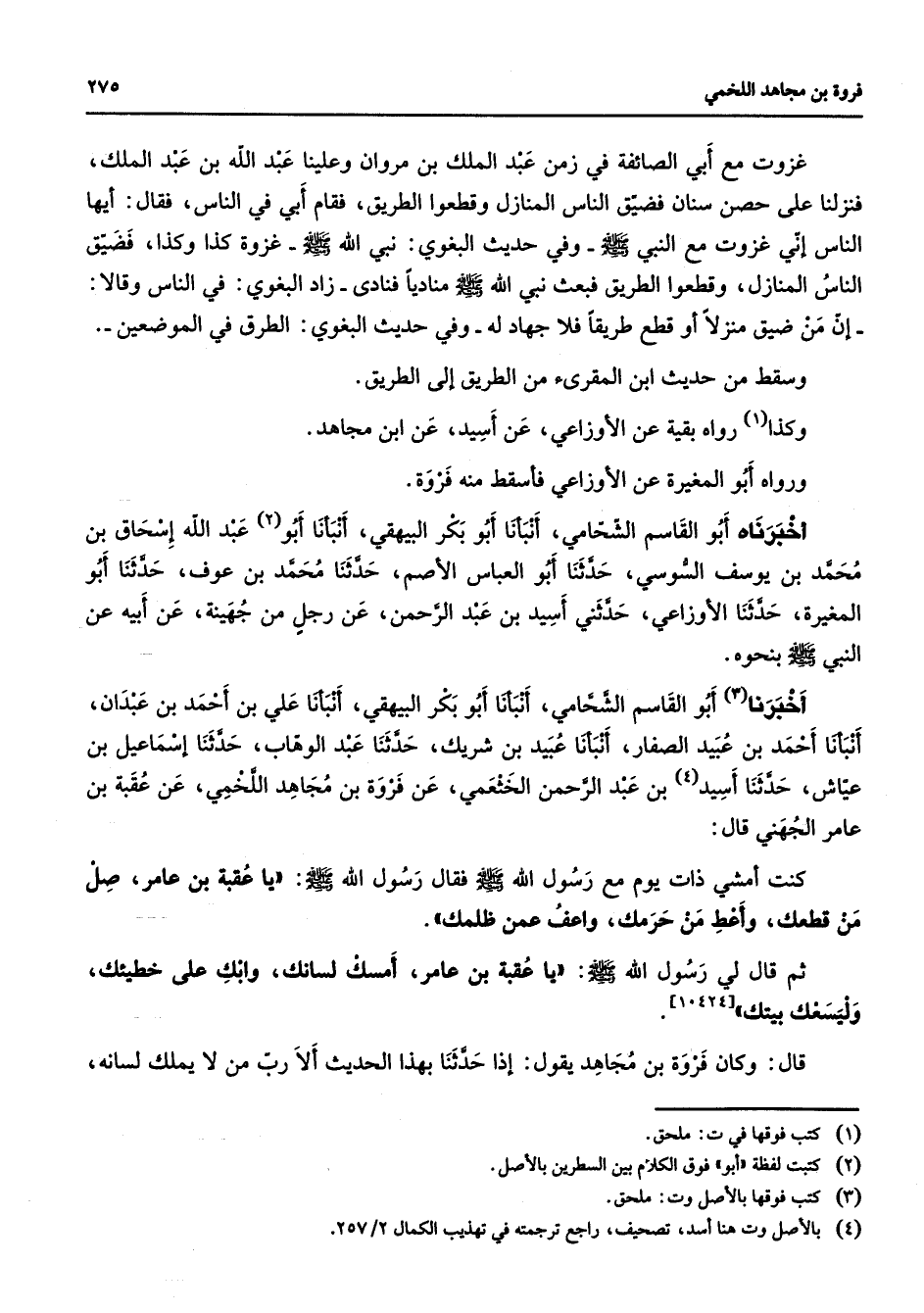غزوت مع أبي الصائفة في زمن عبد الملك بن مروان وعلينا عبد الله بن عبد الملك فنزلنا على حصن سنان فضيق الناس المنازل وقطعوا الطريق فقام أبي في الناس فقال أيها الناس إني غزوت مع النبي (صلى الله عليه وسلم) وفي حديث البغوي نبي الله (صلى الله عليه وسلم) غزوة كذا وكذا فضيق الناس المنازل وقطعوا الطريق فبعث نبي الله (صلى الله عليه وسلم) مناديا فنادى زاد البغوي في الناس وقالا إن من ضيق منزلا أو قطع طريقا فلا جهاد له وفي حديث البغوي الطرق في الموضعين وسقط من حديث ابن المقرئ من الطريق إلى الطريق وكذا (1) رواه بقية عن الأوزاعي عن أسيد عن أبن مجاهد ورواه أبو المغيرة عن الأوزاعي فأسقط منه فروة أخبرناه أبو القاسم الشحامي أنبأنا أبو بكر البيهقي أنبأنا أبو (2) عبد الله إسحاق بن محمد بن يوسف السوسي حدثنا أبو العباس الأصم حدثنا محمد بن عوف حدثنا أبو المغيرة حدثنا الأوزاعي حدثني أسيد بن عبد الرحمن عن رجل من جهينة عن أبيه عن النبي (صلى الله عليه وسلم) بنحوه أخبرنا (3) أبو القاسم الشحامي أنبأنا أبو بكر البيهقي أنبأنا علي بن أحمد بن عبدان أنبأنا أحمد بن عبيد الصفار أنبأنا عبيد بن شريك حدثنا عبد الوهاب حدثنا إسماعيل بن عياش حدثنا أسيد (4) بن عبد الرحمن الخثعمي عن فروة بن مجاهد اللخمي عن عقبة بن عامر عامر الجهني قال كنت أمشي ذات يوم مع رسول الله (صلى الله عليه وسلم) فقال رسول الله (صلى الله عليه وسلم) يا عقبة بن عامر صل من قطعك وأعط من حرمك واعف عمن ظلمك ثم قال لي رسول الله (صلى الله عليه وسلم) يا عقبة بن عامر أمسك لسانك وابك على خطيئتك وليسعك بيتك قال وكان فروة بن مجاهد يقول إذا حدثنا بهذا الحديث ألا رب من لا يملك لسانه