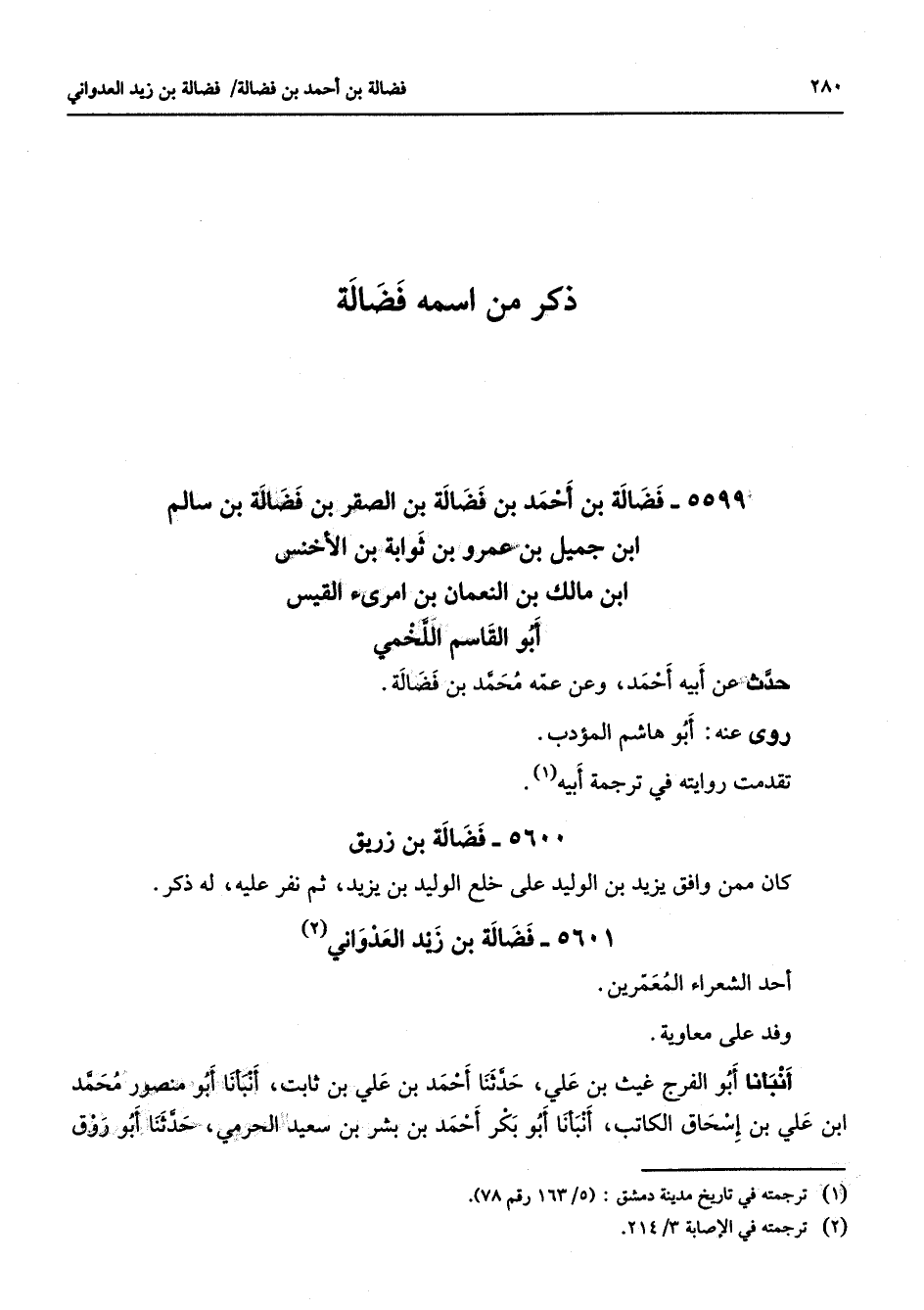 5600 - فضالة بن زيد العدواني (2) أحد الشعراء المعمرين وفد على معاوية أنبأنا أبو الفرج غيث بن علي حدثنا أحمد بن علي بن ثابت أنبأنا أبو منصور محمد ابن علي بن إسحاق الكاتب أنبأنا أبو بكر أحمد بن بشر بن سعيد الحرمي حدثنا أبو روق