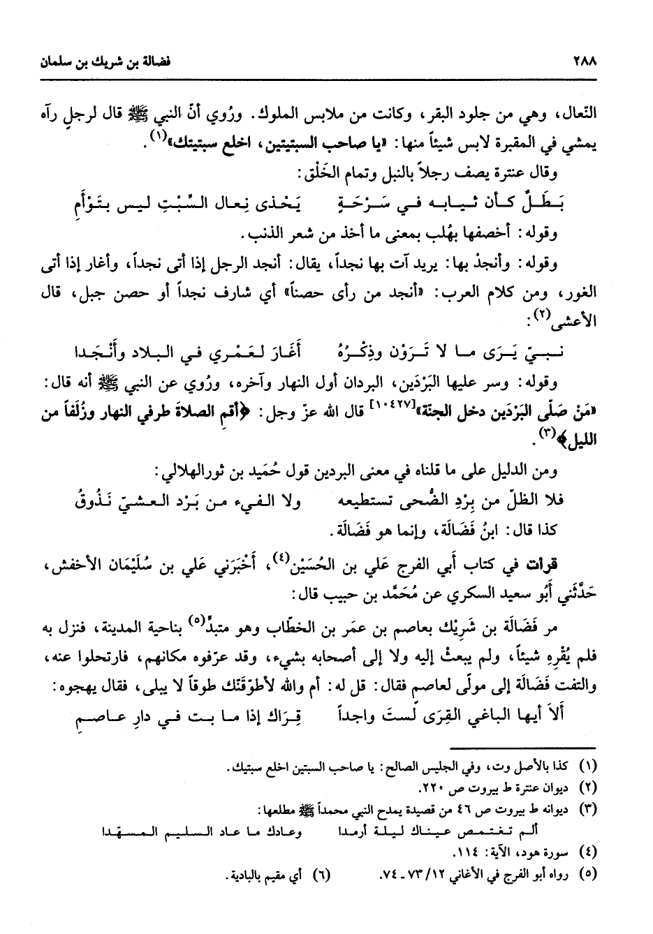 النعال وهي من جلود البقر وكانت من ملابس الملوك وروي أن النبي (صلى الله عليه وسلم) قال لرجل رآه يمشي في المقبرة لابس شيئا منها يا صاحب السبتيتين اخلع سبتيتك (1) وقال عنترة يصف رجلا بالنبل وتمام الخلق بطل كأن ثيابه في سرحة * يحذى نعال السبت ليس بتوأم * وقوله أخصفها بهلب بمعنى ما أخذ من شعر الذنب وقوله وأنجد بها يريد آت بها نجدا يقال أنجد الرجل إذا أتى نجدا وأغار إذا أتى الغور ومن كلام العرب أنجد من رأى حصنا أي شارف نجدا أو حصن جبل قال الأعشى * (2) نبي يرى ما لا ترون وذكره * أغار لعمري في البلاد وأنجدا * وقوله وسر عليها البردين البردان أول النهار وآخره وروي عن النبي (صلى الله عليه وسلم) أنه قال من صلى البردين دخل الجنة قال الله عز وجل " أقم الصلاة طرفي النهار وزلفا من الليل (3) " ومن الدليل على ما قلناه في معنى البردين قول حميد بن ثور الهلالي فلا الظل من برد الضحى تستطيعه * ولا الفئ من برد العشي نذوق * كذا قال ابن فضالة وإنما هو فضالة قرأت في كتاب أبي الفرج علي بن الحسين (4) أخبرني علي بن سليمان الأخفش حدثني أبو سعيد السكري عن محمد بن حبيب قال مر فضالة بن شريك بعاصم بن عمر بن الخطاب وهو متبد (5) بناحية المدينة فنزل به فلم يقره شيئا ولم يبعث إليه ولا إلى أصحابه بشئ وقد عرفوه مكانهم فارتحلوا عنه والتفت فضالة إلى مولى لعاصم فقال قل له أم والله لأطوقنك طوقا لا يبلى فقال يهجوه ألا أيها الباغي القرى لست واجدا * قراك إذا ما بت في دار عاصم