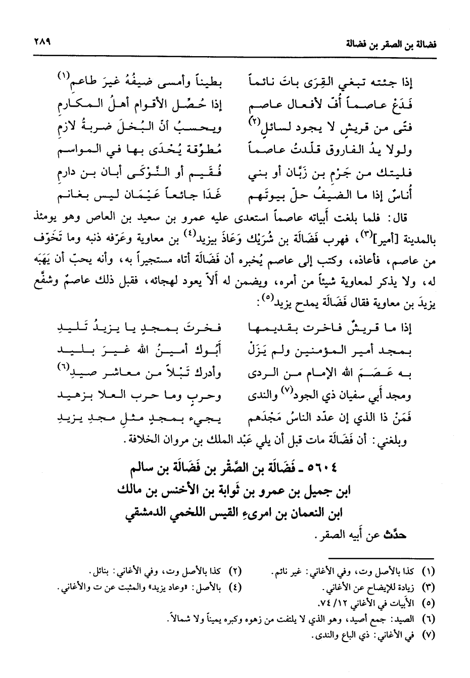 إذا جئته تبغي القرى بات نائما * بطينا وأمسى ضيفه غير طاعم (1) فدع عاصما أف لأفعال عاصم * إذا حصل الأقوام أهل المكارم فتى من قريش لا يجود لسائل (2) * ويحسب أن البخل ضربة لازم ولولا يد الفاروق قلدت عاصما * مطوقة يحدى بها في المواسم فليتك من جرم بن زبان أو بني * فقيم أو النوكى أبان بن دارم أناس إذا ما الضيف حل بيوتهم * غدا جائعا عيمان ليس بغانم * قال فلما بلغت أبياته عاصما استعدى عليه عمرو بن سعيد بن العاص وهو يومئذ بالمدينة أمير (3) فهرب فضالة بن شريك وعاذ بيزيد (4) بن معاوية وعرفه ذنبه وما تخوف من عاصم فأعاذه وكتب إلى عاصم يخبره أن فضالة أتاه مستجيرا به وأنه يحب أن يهبه له ولا يذكر لمعاوية شيئا من أمره ويضمن له ألا يعود لهجائه فقبل ذلك عاصم وشفع يزيد بن معاوية فقال فضالة يمدح يزيد (5) * إذا ما قريش فاخرت بقديمها * فخرت بمجد يا يزيد تليد بمجد أمير المؤمنين ولم يزل * أبوك أمين الله غير بليد به عصم الله الإمام من الردى * وأدرك تتلا من معاشر صيد (6) ومجد أبي سفيان ذي الجود (7) والندى * وحرب وما حرب العلا بزهيد فمن ذا الذي إن عدد الناس مجدهم * يجئ بمجد مثل مجد يزيد * وبلغني أن فضالة مات قبل أن يلي عبد الملك بن مروان الخلافة