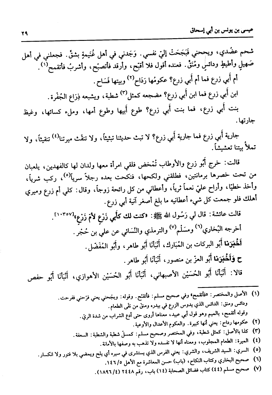 شحم عضدي ويححني فبجحت إلي نفسي وجدني في أهل غنيمة بشق فجعلني في أهل صهيل وأطيط ودائس ومنق فعنده أقول فلا أقبح وأرقد فأتصبح وأشرب فأتقمح (1) أم أبي زرع فما أم أبي زرع عكومها رداح (2) وبيتها فساح ابن ابي زرع فما ابن أبي زرع مضجعه كمثل (3) شطبه ويشبعه ذراع الجفرة بنت أبي زرع فما بنت أبي زرع طوع أبيها وطوع أمها وملء كسائها وغيظ جارتها جارية أبي زرع فما جارية أبي زرع لا تبث حديثنا تبثيثا ولا تنقث ميرتنا (4) تنقيثا ولا تملأ بيتنا تعشيشا قالت خرج أبو زرع والأوطاب تمخض فلقي امرأة معها ولدان لها كالفهدين يلعبان من تحت خصرها برمانتين فطلقني ولكحها فنكحت بعده رجلا سريا (5) ركب شريا وأخذ خطيا وأراح علي نعما ثريا وأعطاني من كل رائحة زوجا وقال كلي أم زرع وميري أهلك فلو جمعت كل شئ أعطانيه ما بلغ أصغر آنية أبي زرع قالت عائشة قال لي رسول الله (صلى الله عليه وسلم) كنت لك كأبي زرع لأم زرع) أخرجه البخاري (6) ومسلم (7) والترمذي والنسائي عن علي بن حجر أخبرنا أبو البركات بن المبارك أنبأنا أبو طاهر وأبو المفضل ح وأخبرنا أبو العز بن منصور أنبأنا أبو طاهر قالا أنبأنا أبو الحسين الأصبهاني أنبأنا أبو الحسين الأهوازي أنبأنا أبو حفص